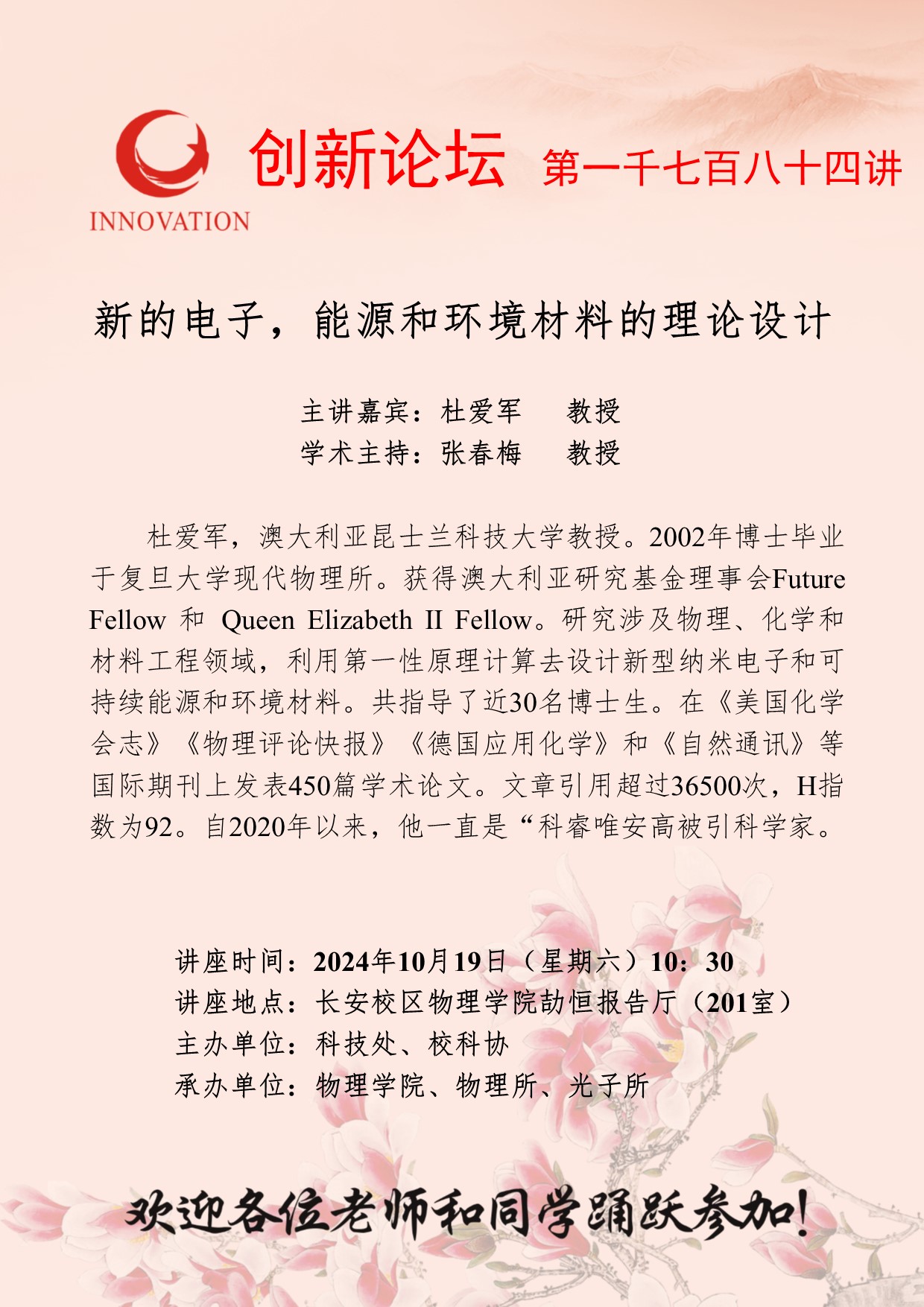 杜爱军 教授 九游会在线登录官网创新论坛第一千七百八十四讲:新的电子,能源和环境材料的理论设计 讲座时间 2024年10月19日(星期六)10:30 讲座地点 长安校区物理学院劼恒报告厅(201室) 讲座人介绍 杜爱军 教授 讲座内容