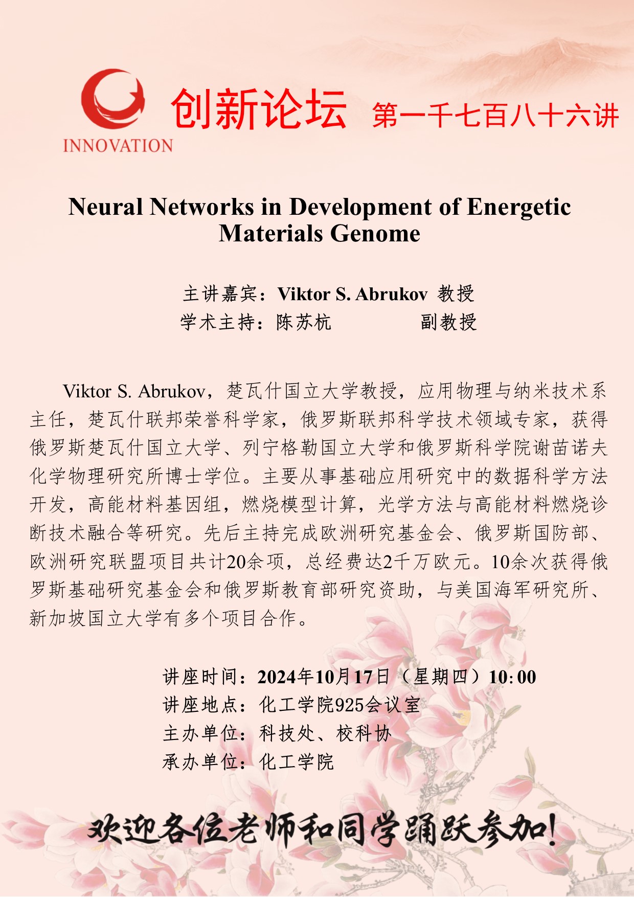 Viktor S. Abrukov 教授 九游会在线登录官网创新论坛第一千七百八十六讲:Neural Networks in Development of Energetic Materials Genome 讲座时间 2024年10月17日(星期四)10:00 讲座地点 化工学院925会议室 讲座人介绍 Viktor S. Abrukov 教授 讲座内容