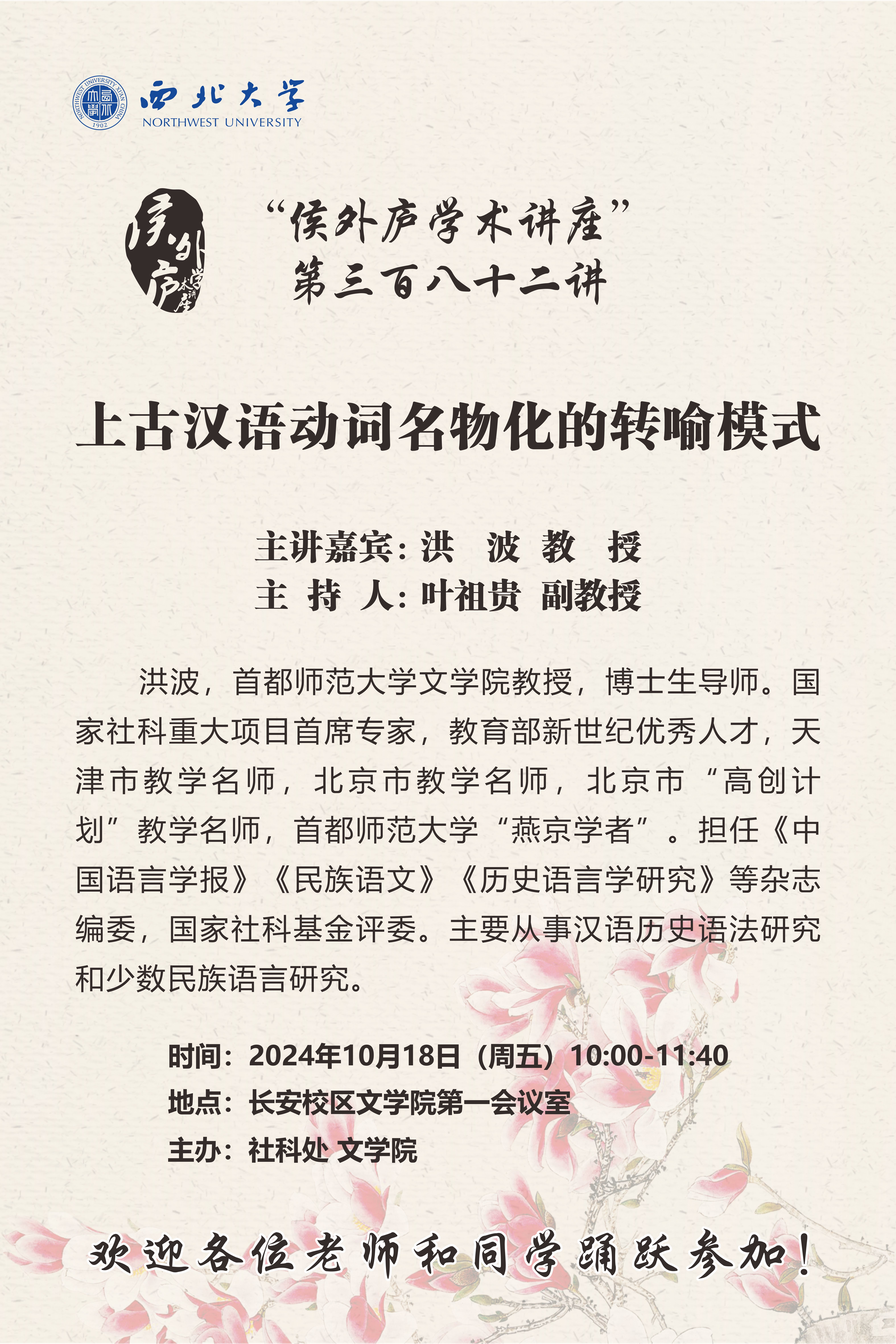 洪波 教授 “侯外庐学术讲座”第三百八十二讲:上古汉语动词名物化的转喻模式 讲座时间 2024年10月18日(周五)10:00-11:40 讲座地点 长安校区文学院第一会议室 讲座人介绍 洪波 教授 讲座内容