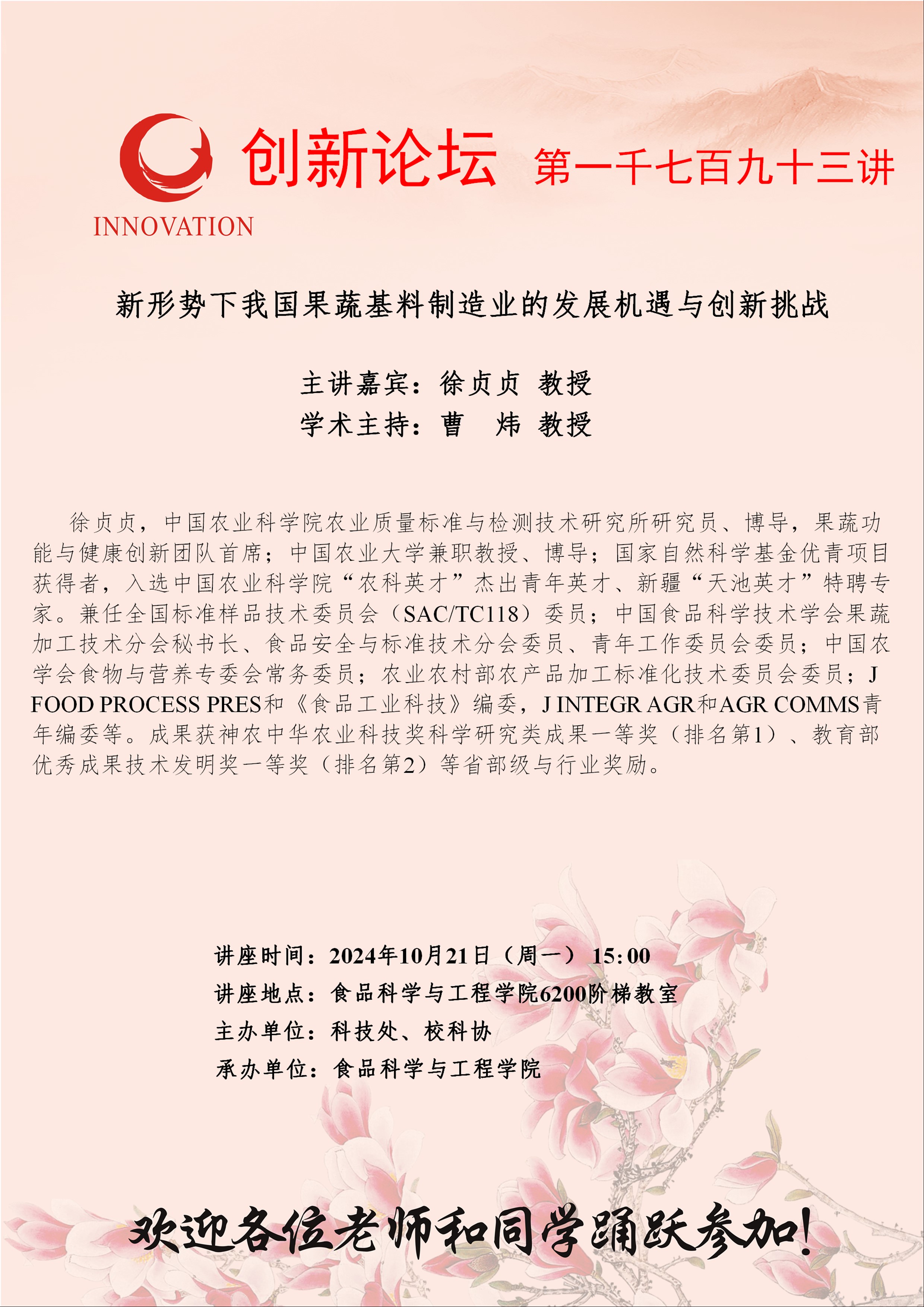 徐贞贞 教授 九游会在线登录官网创新论坛第一千七百九十三讲: 新形势下我国果蔬基料制造业的发展机遇与创新挑战 讲座时间 2024年10月21日(星期一)15:00 讲座地点 太白校区食品科学与工程学院6200阶梯教室 讲座人介绍 徐贞贞 教授 讲座内容
