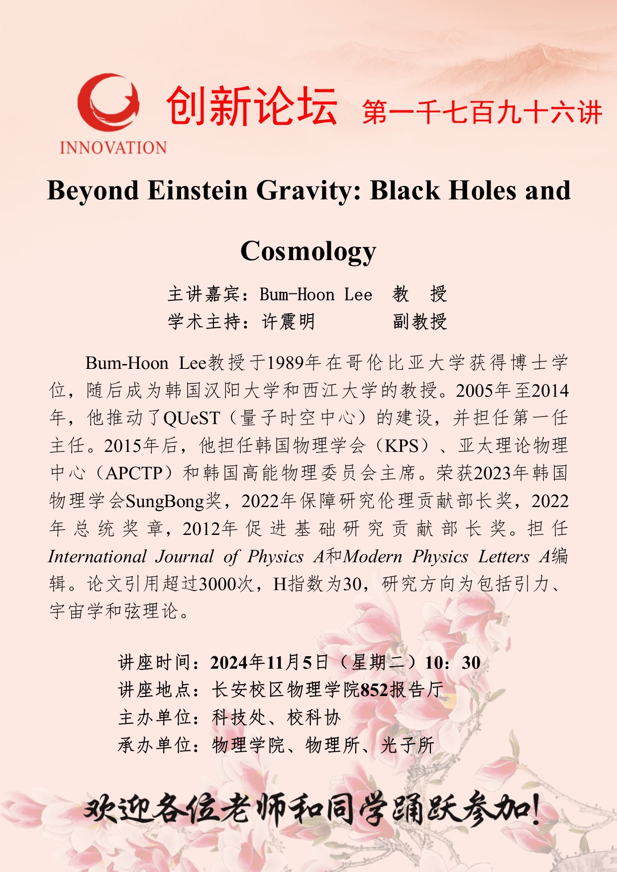 Bum-Hoon Lee 教授 九游会在线登录官网创新论坛第一千七百九十六讲:Beyond Einstein Gravity: Black Holes and Cosmology 讲座时间 2024年11月5日(星期二)10:30 讲座地点 长安校区物理学院852报告厅 讲座人介绍 Bum-Hoon Lee 教授 讲座内容