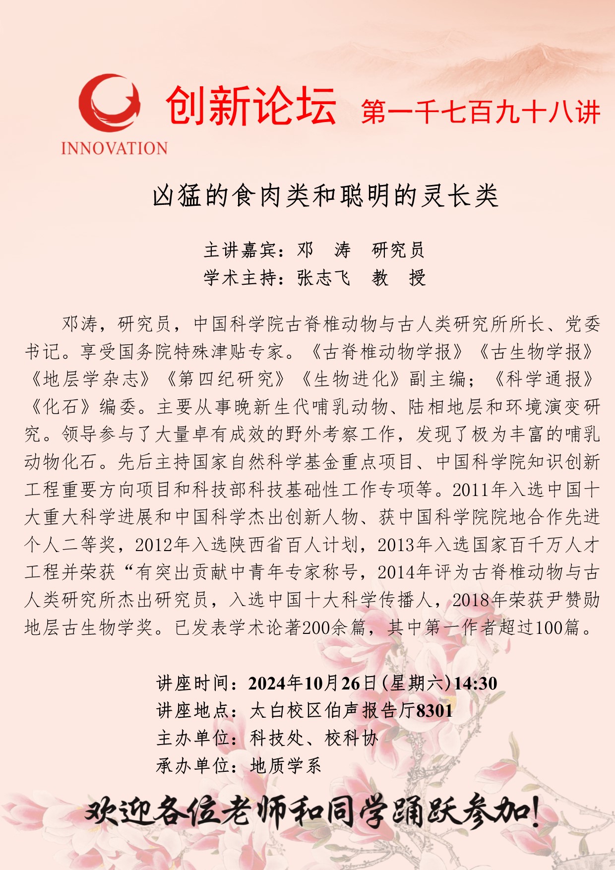 邓涛 研究员 九游会在线登录官网创新论坛第一千七百九十八讲:凶猛的食肉类和聪明的灵长类 讲座时间 2024年10月26日(星期六)14:30 讲座地点 太白校区伯声报告厅8301 讲座人介绍 邓涛 研究员 讲座内容