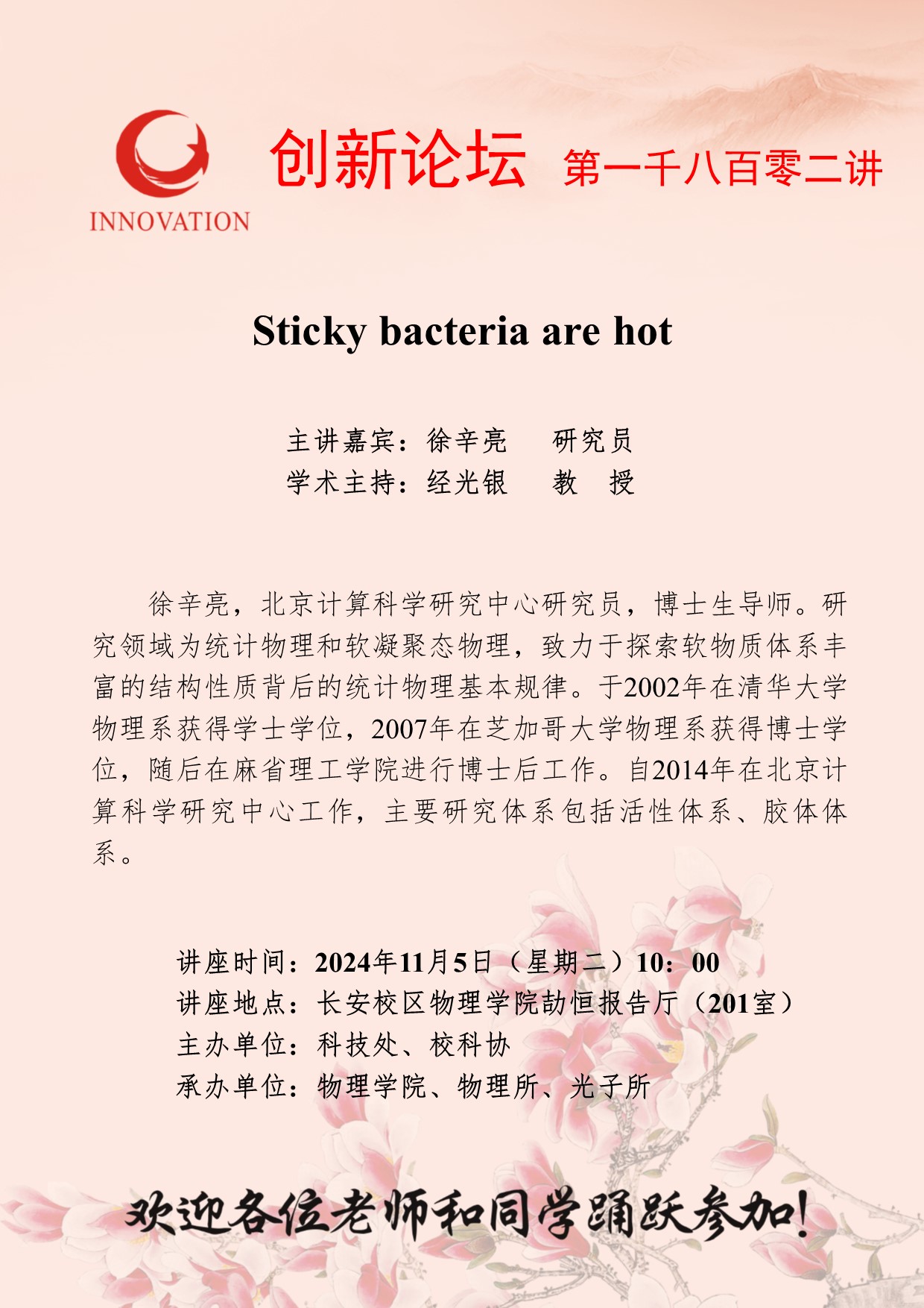 徐辛亮 研究员 九游会在线登录官网创新论坛第一千八百零二讲:Sticky bacteria are hot 讲座时间 2024年11月5日(星期二)10:00 讲座地点 长安校区物理学院劼恒报告厅(201室) 讲座人介绍 徐辛亮 研究员 讲座内容