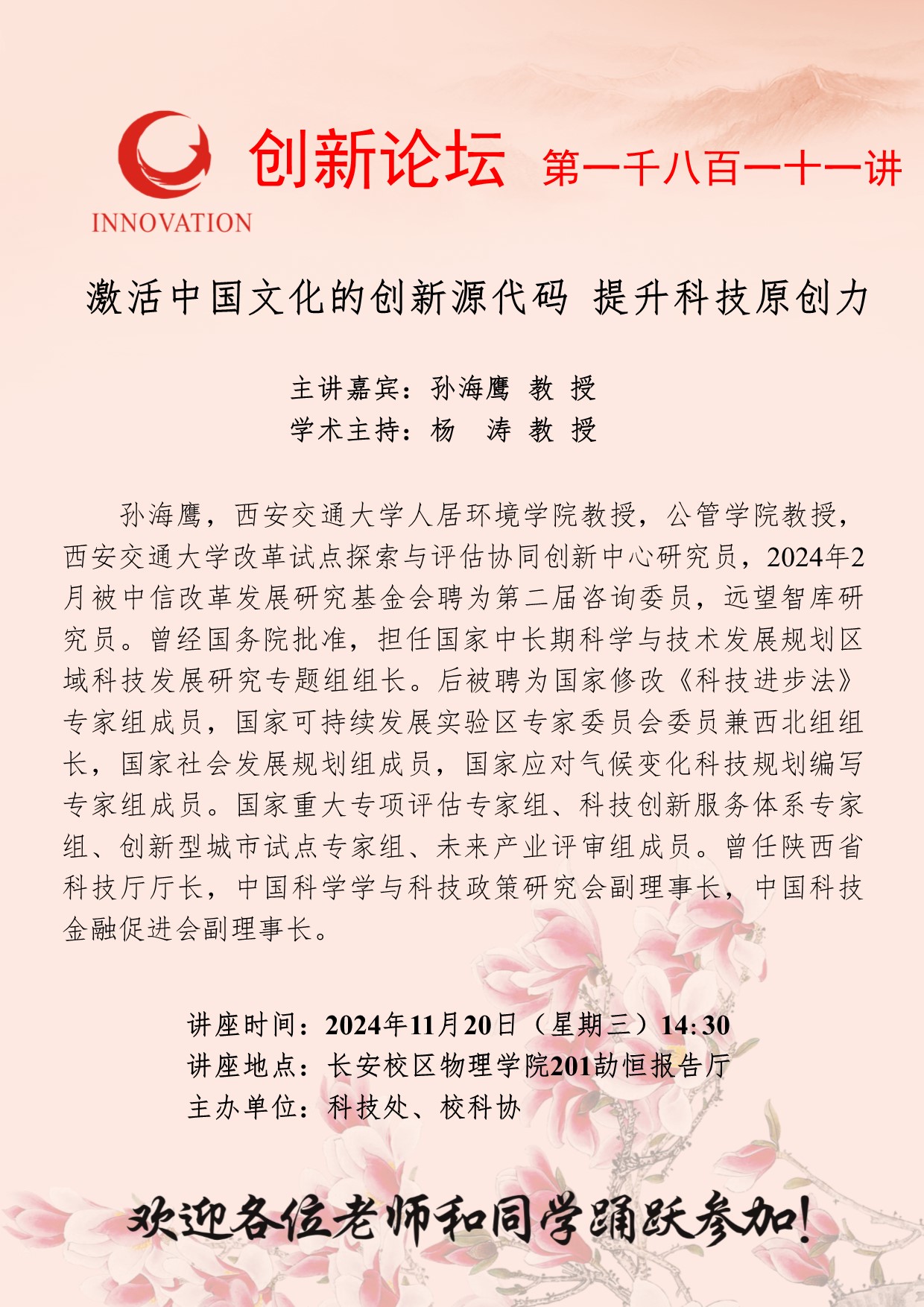 孙海鹰 教授 九游会在线登录官网创新论坛第一千八百一十一讲:激活中国文化的创新源代码 提升科技原创力 讲座时间 2024年11月20日(星期三)14:30 讲座地点 长安校区物理学院201劼恒报告厅 讲座人介绍 孙海鹰 教授 讲座内容