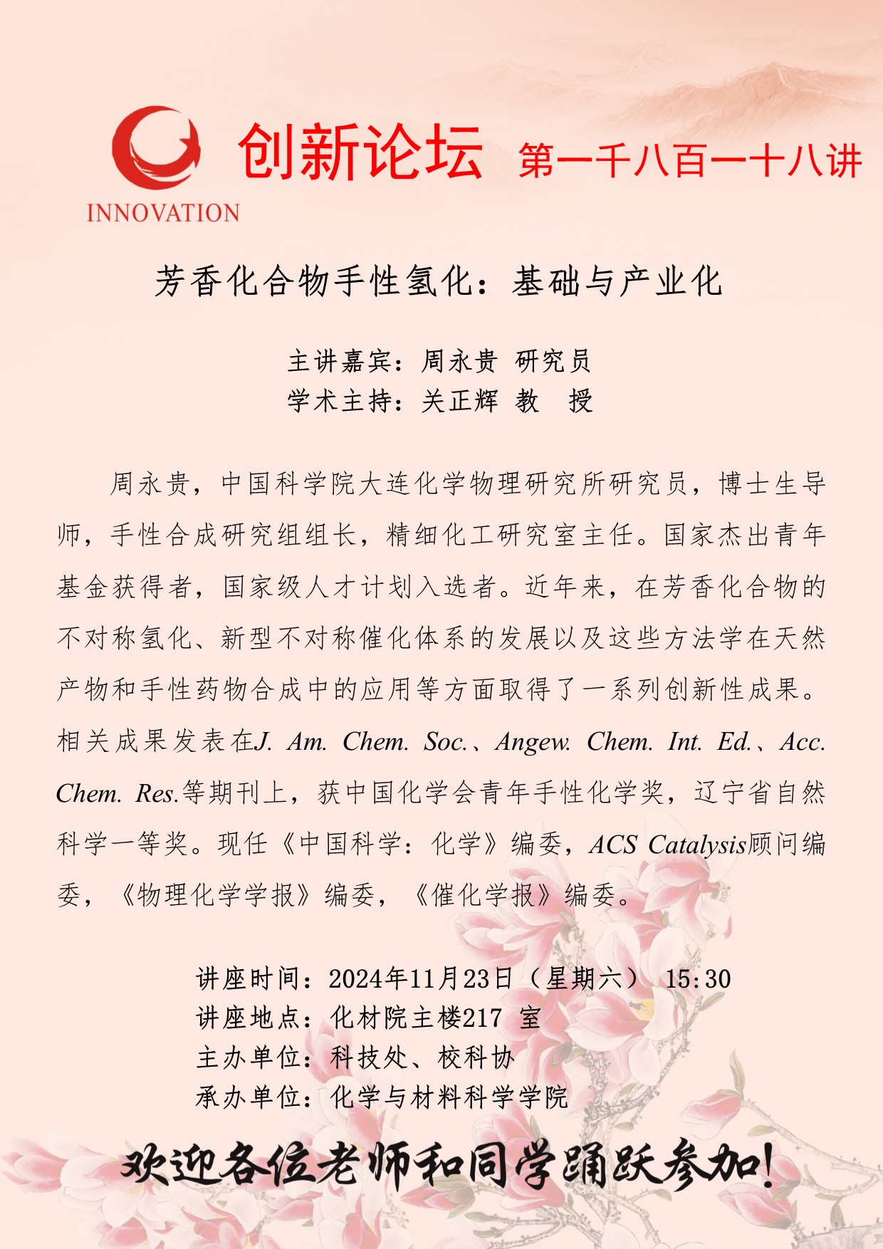 周永贵 研究员 九游会在线登录官网创新论坛第一千八百一十八讲:芳香化合物手性氢化:基础与产业化 讲座时间 2024年11月23日(星期六) 15:30 讲座地点 化材院主楼217 室 讲座人介绍 周永贵 研究员 讲座内容