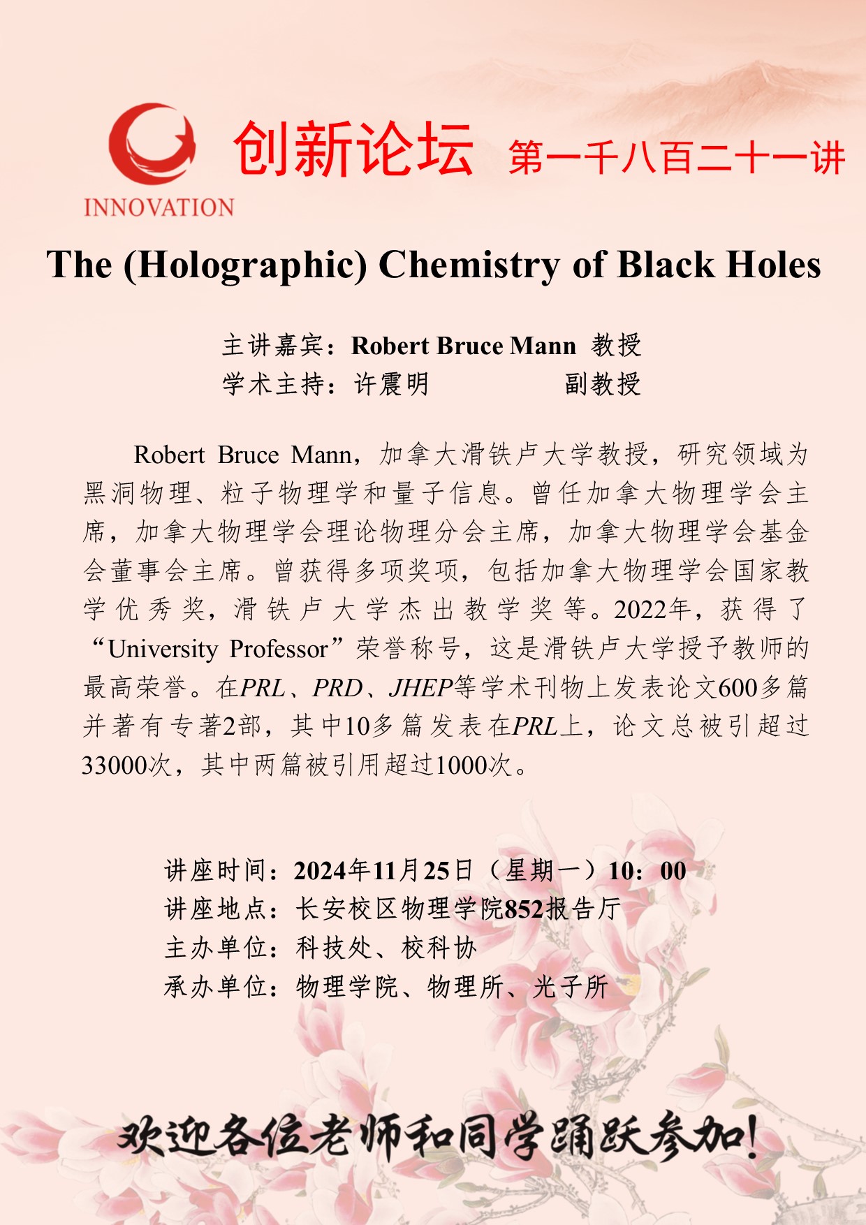 Robert Bruce Mann 教授 九游会在线登录官网创新论坛第一千八百二十一讲:The (Holographic) Chemistry of Black Holes 讲座时间 2024年11月25日(星期一)10:00 讲座地点 长安校区物理学院852报告厅 讲座人介绍 Robert Bruce Mann 教授 讲座内容