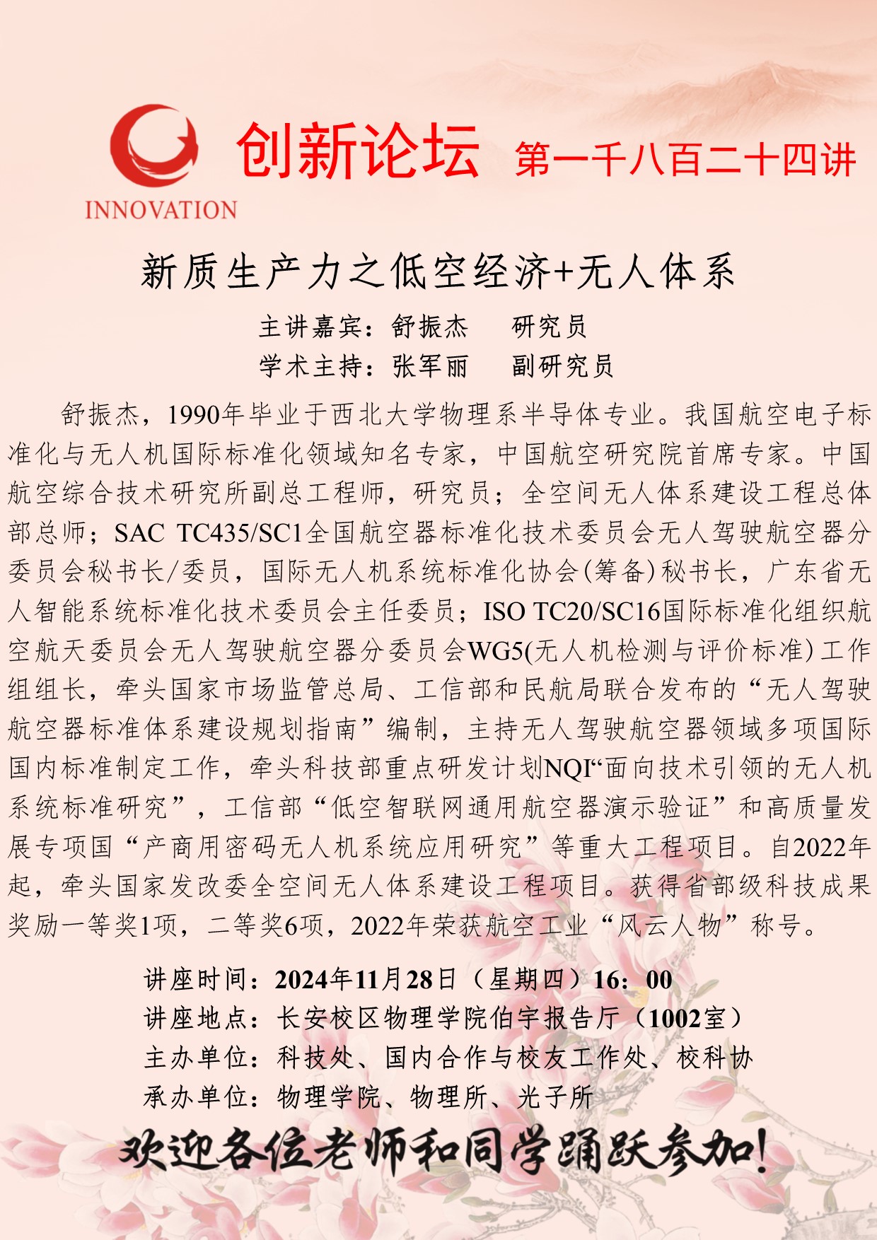 舒振杰 研究员 九游会在线登录官网创新论坛第一千八百二十四讲:新质生产力之低空经济+无人体系 讲座时间 2024年11月28日(星期四)16:00 讲座地点 长安校区物理学院伯宇报告厅(1002室) 讲座人介绍 舒振杰 研究员 讲座内容