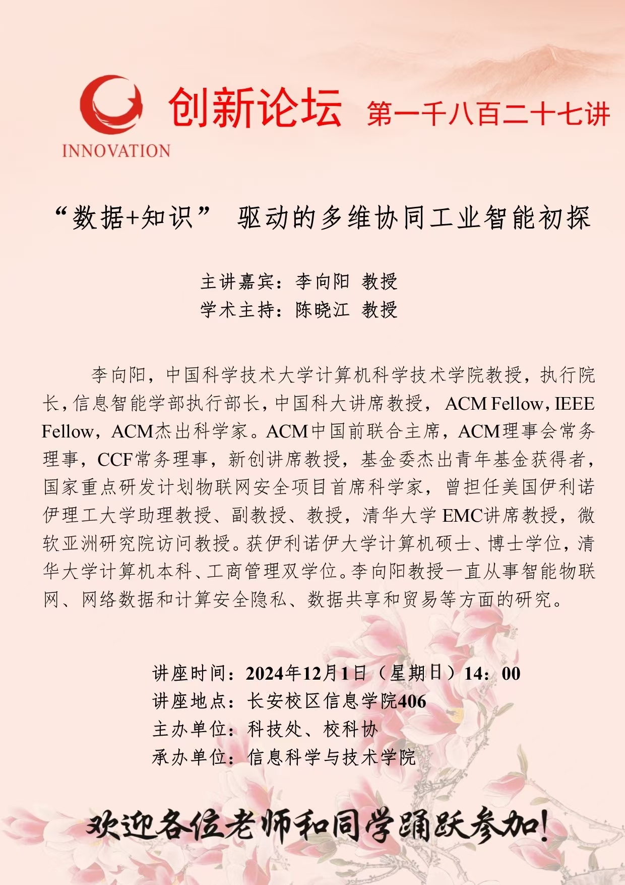 李向阳 教授 九游会在线登录官网创新论坛第一千八百二十七讲:“数据+知识” 驱动的多维协同工业智能初探 讲座时间 2024年12月1日(星期日)14:00 讲座地点 长安校区信息学院406 讲座人介绍 李向阳 教授 讲座内容