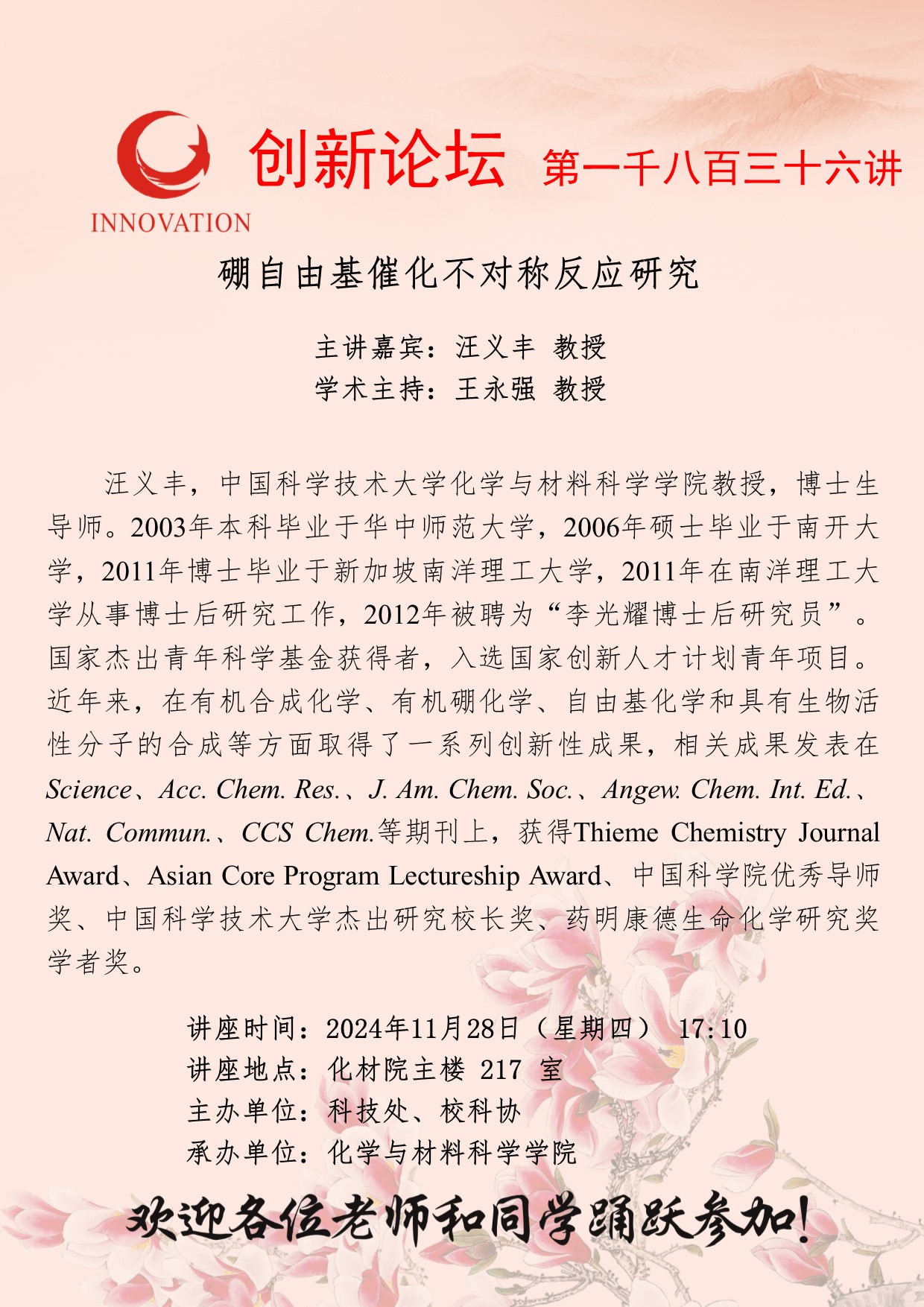 汪义丰 教授 九游会在线登录官网创新论坛第一千八百三十六讲:硼自由基催化不对称反应研究 讲座时间 2024年11月28日(星期四) 17:10 讲座地点 化材院主楼217室 讲座人介绍 汪义丰 教授 讲座内容