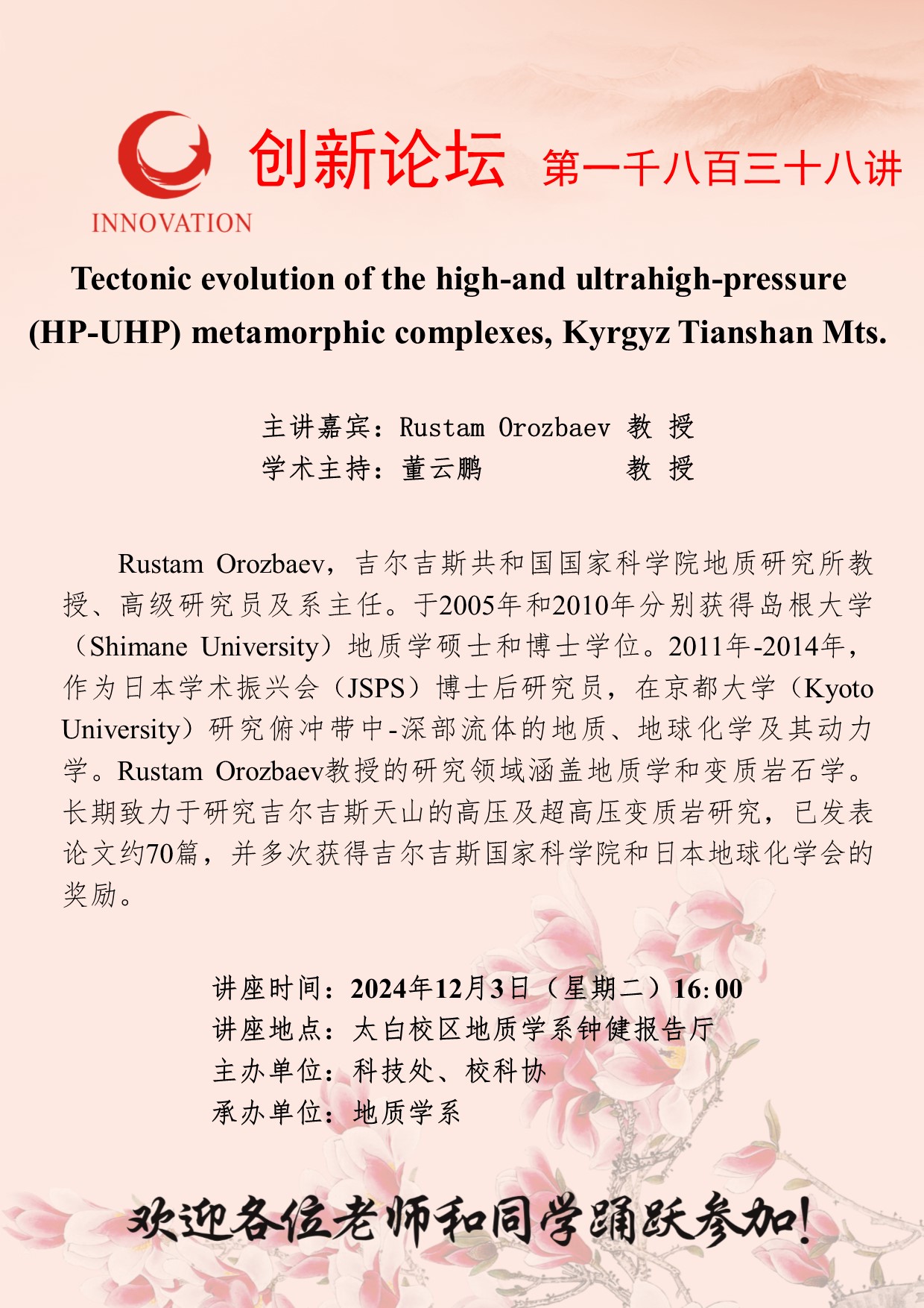 Rustam Orozbaev 教 授 九游会在线登录官网创新论坛第一千八百三十八讲:Tectonic evolution of the high-and ultrahigh-pressure (HP-UHP) metamorphic complexes, Kyrgyz Tianshan Mts. 讲座时间 2024年12月3日(星期二)16:00 讲座地点 太白校区地质学系钟健报告厅 讲座人介绍 Rustam Orozbaev 教 授 讲座内容