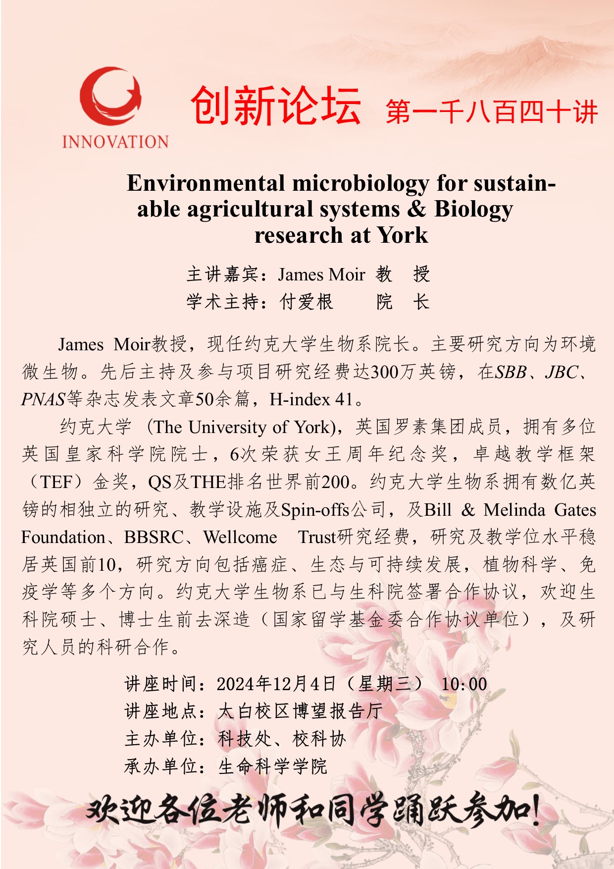 James Moir 教授 九游会在线登录官网创新论坛第一千八百四十讲:Environmental microbiology for sustainable agricultural systems & Biology research at York 讲座时间 2024年12月4日(星期三) 10:00 讲座地点 太白校区博望报告厅 讲座人介绍 James Moir 教授 讲座内容