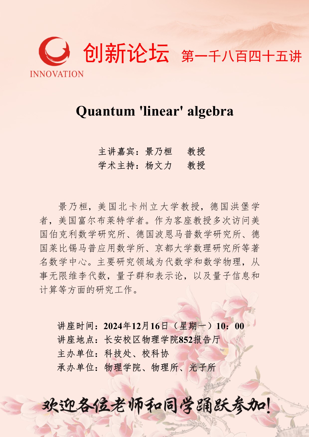 景乃桓 教授 九游会在线登录官网创新论坛第一千八百四十五讲:Quantum 'linear' algebra 讲座时间 2024年12月16日(星期一)10:00 讲座地点 长安校区物理学院852报告厅 讲座人介绍 景乃桓 教授 讲座内容