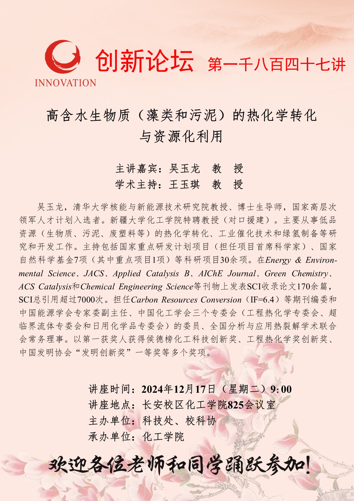 吴玉龙 教授 九游会在线登录官网创新论坛第一千八百四十七讲:高含水生物质(藻类和污泥)的热化学转化与资源化利用 讲座时间 2024年12月17日(星期二)9:00 讲座地点 长安校区化工学院825会议室 讲座人介绍 吴玉龙 教授 讲座内容