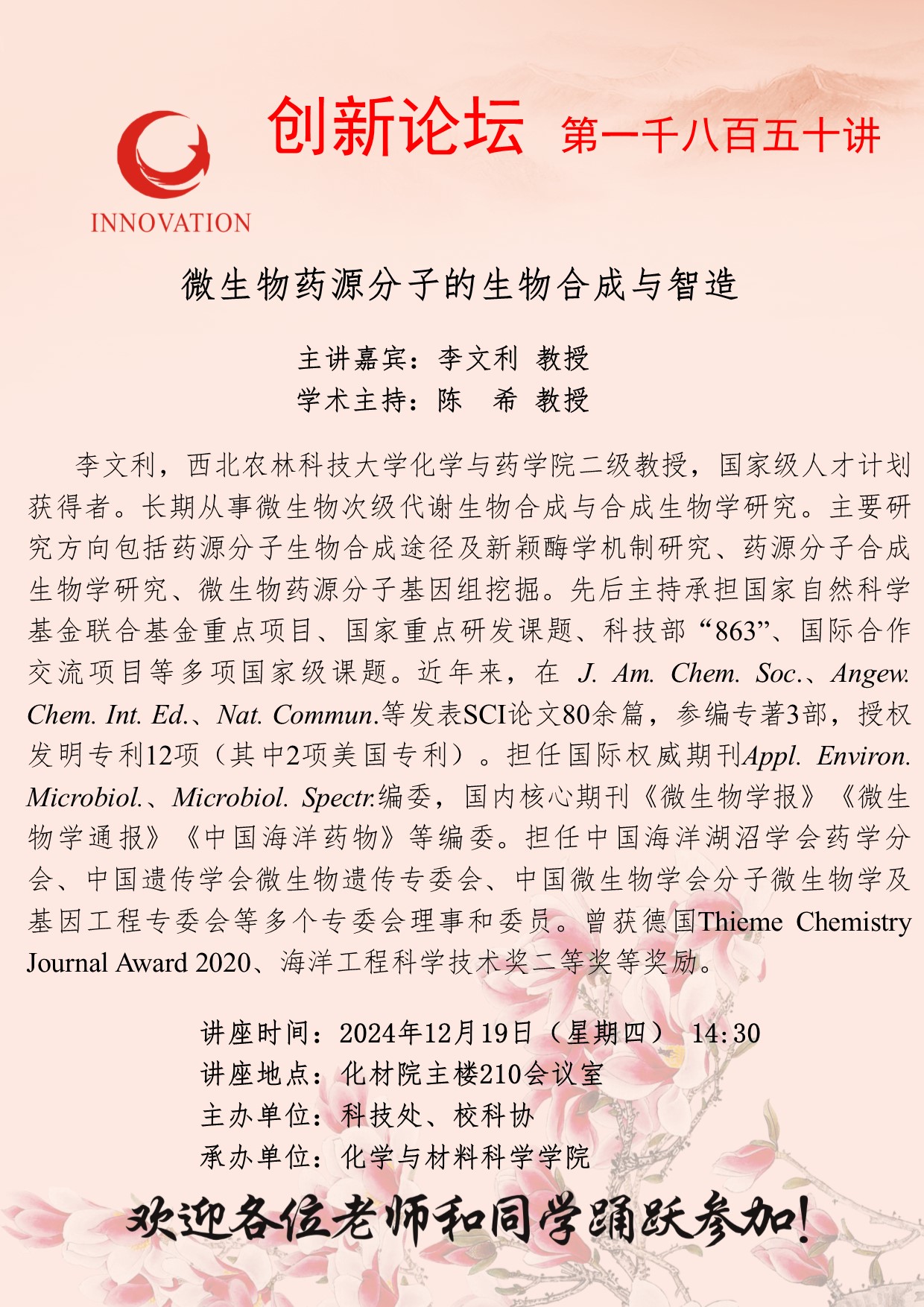 李文利 教授 九游会在线登录官网创新论坛第一千八百五十讲:微生物药源分子的生物合成与智造 讲座时间 2024年12月19日(星期四) 14:30 讲座地点 化材院主楼210会议室 讲座人介绍 李文利 教授 讲座内容