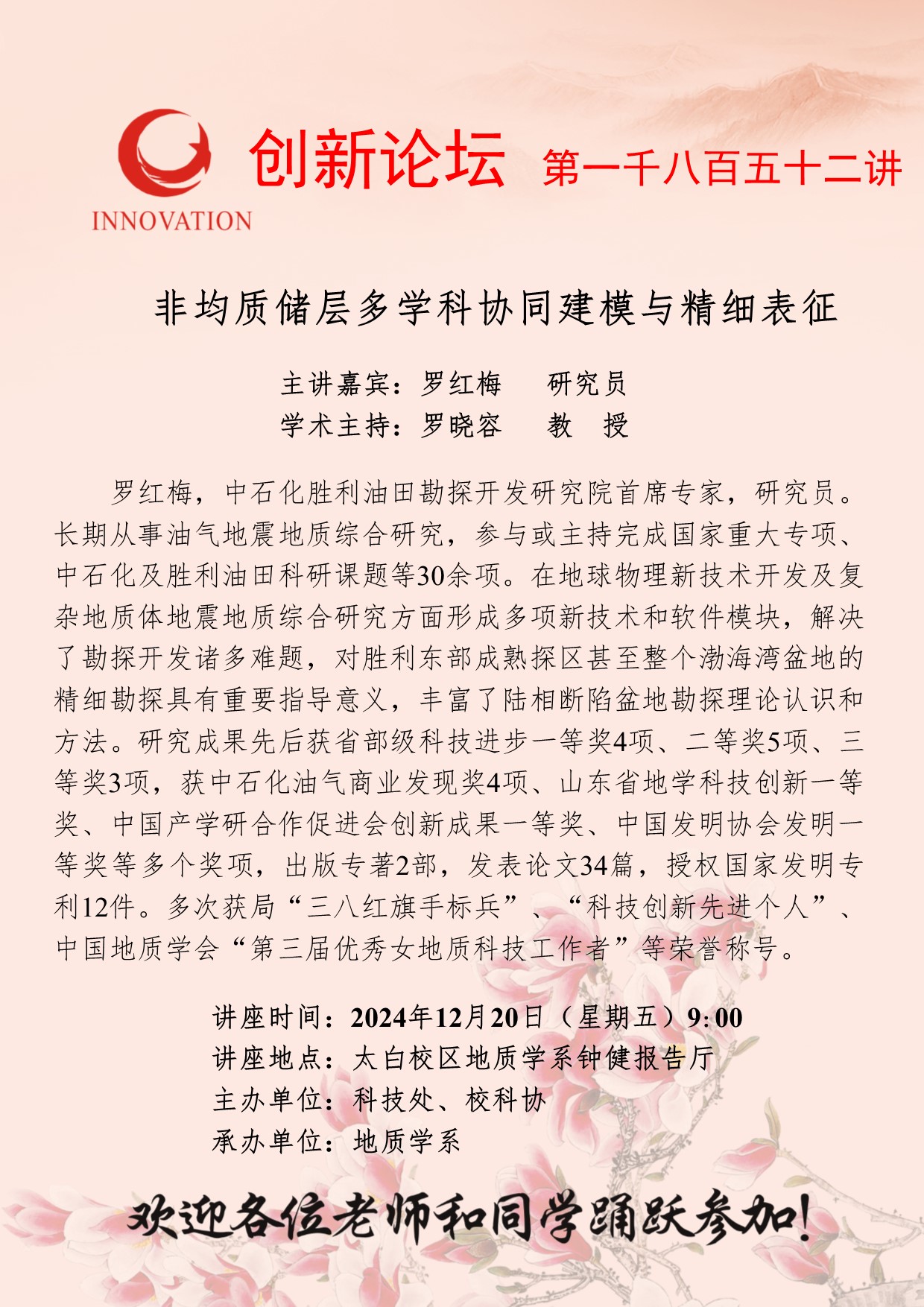 罗红梅 研究员 九游会在线登录官网创新论坛第一千八百五十二讲:非均质储层多学科协同建模与精细表征 讲座时间 2024年12月20日(星期五)9:00 讲座地点 太白校区地质学系钟健报告厅 讲座人介绍 罗红梅 研究员 讲座内容