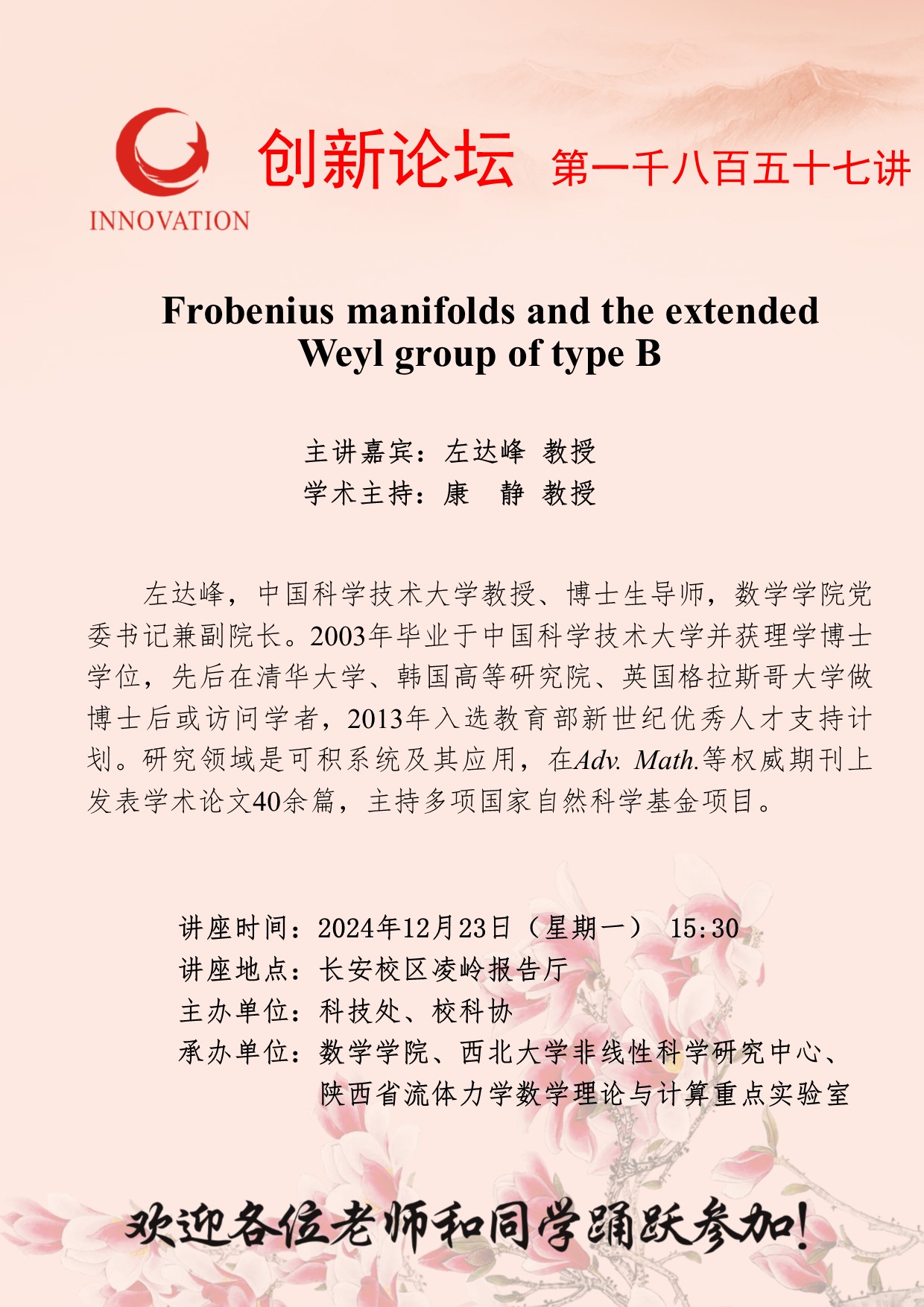 左达峰 教授 九游会在线登录官网创新论坛第一千八百五十七讲:Frobenius manifolds and the extended Weyl group of type B 讲座时间 2024年12月23日(星期一) 15:30 讲座地点 长安校区凌岭报告厅 讲座人介绍 左达峰 教授 讲座内容