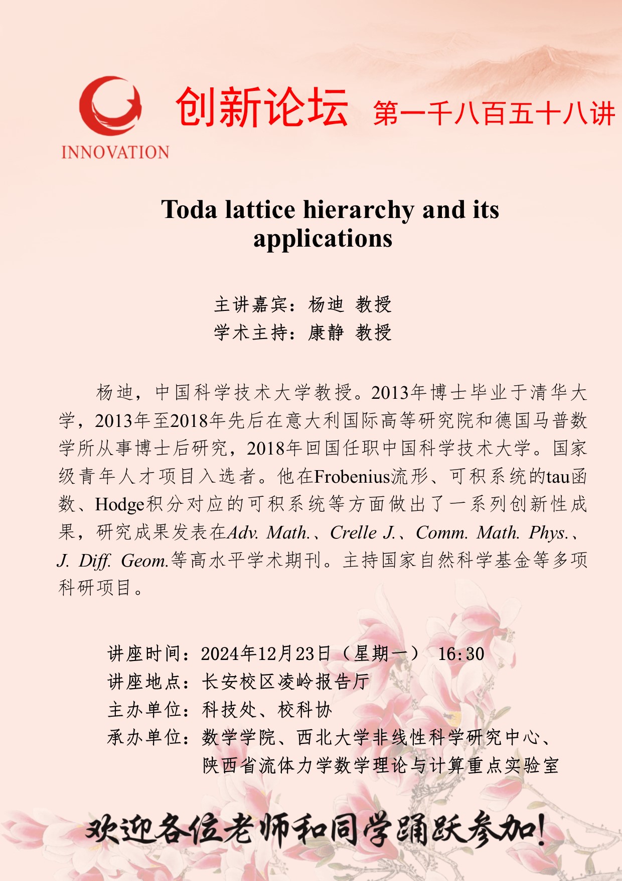 杨迪 教授 九游会在线登录官网创新论坛第一千八百五十八讲:Toda lattice hierarchy and its applications 讲座时间 2024年12月23日(星期一) 16:30 讲座地点 长安校区凌岭报告厅 讲座人介绍 杨迪 教授 讲座内容