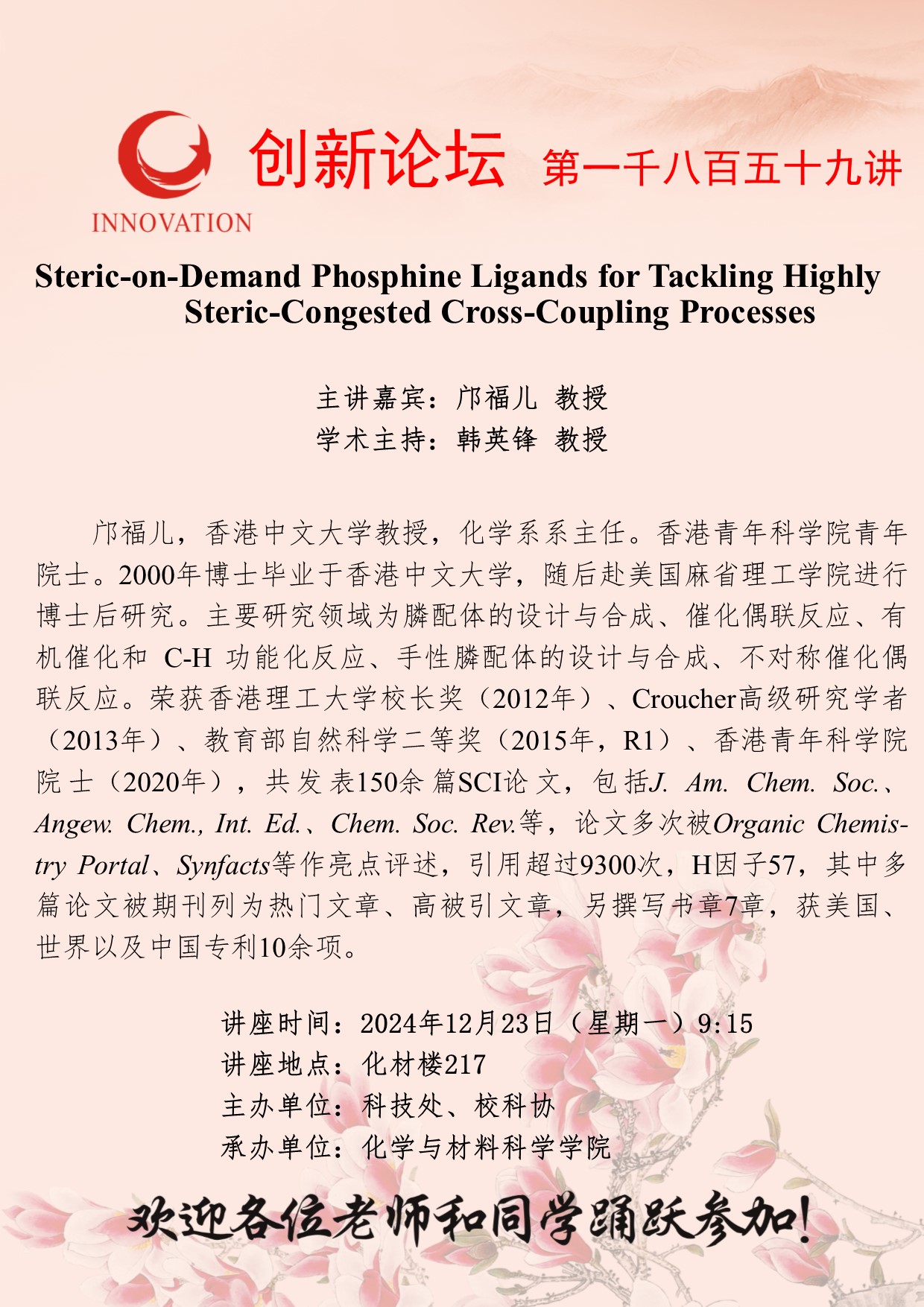 邝福儿 教授 九游会在线登录官网创新论坛第一千八百五十九讲:Steric-on-Demand Phosphine Ligands for Tackling Highly Steric-Congested Cross-Coupling Processes 讲座时间 2024年12月23日(星期一)9:15 讲座地点 化材楼217 讲座人介绍 邝福儿 教授 讲座内容