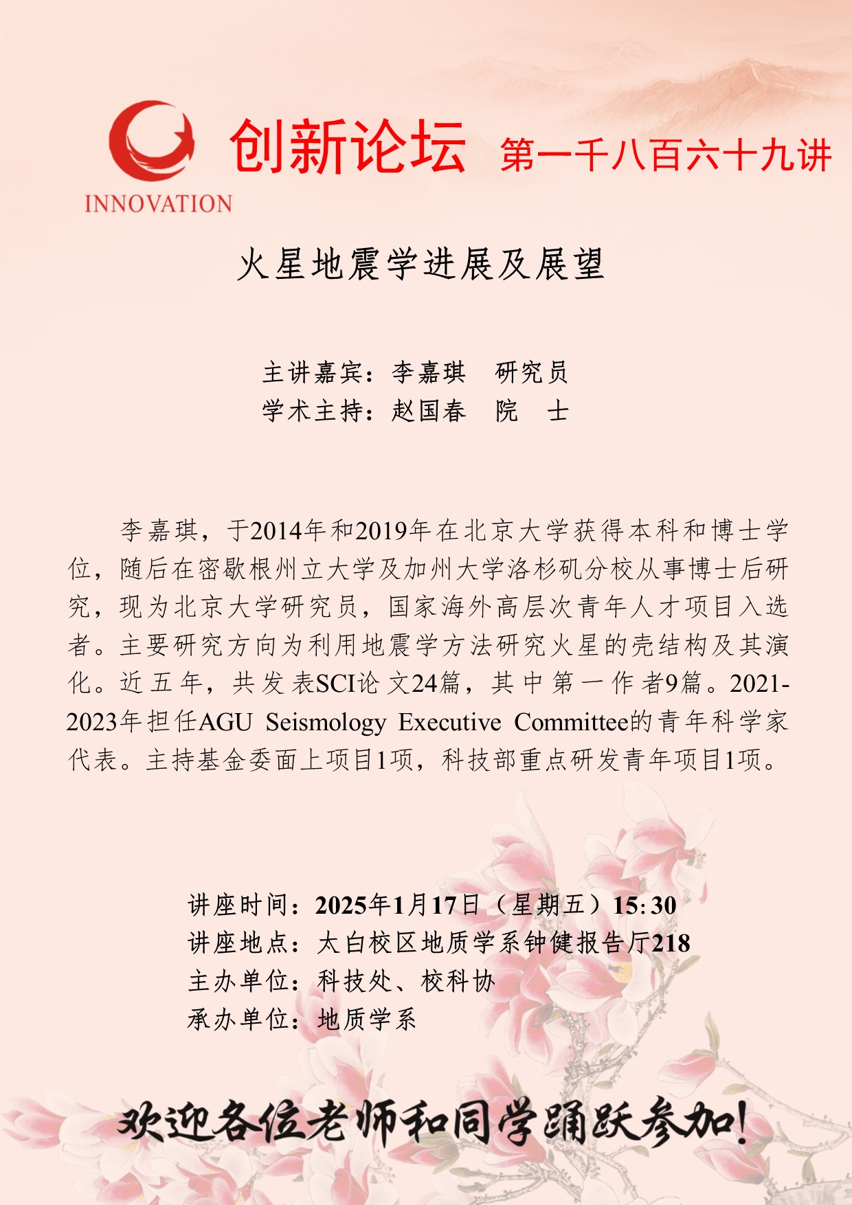 李嘉琪 研究员 九游会在线登录官网创新论坛第一千八百六十九讲:火星地震学进展及展望 讲座时间 2025年1月17日(星期五)15:30 讲座地点 太白校区地质学系钟健报告厅218 讲座人介绍 李嘉琪 研究员 讲座内容