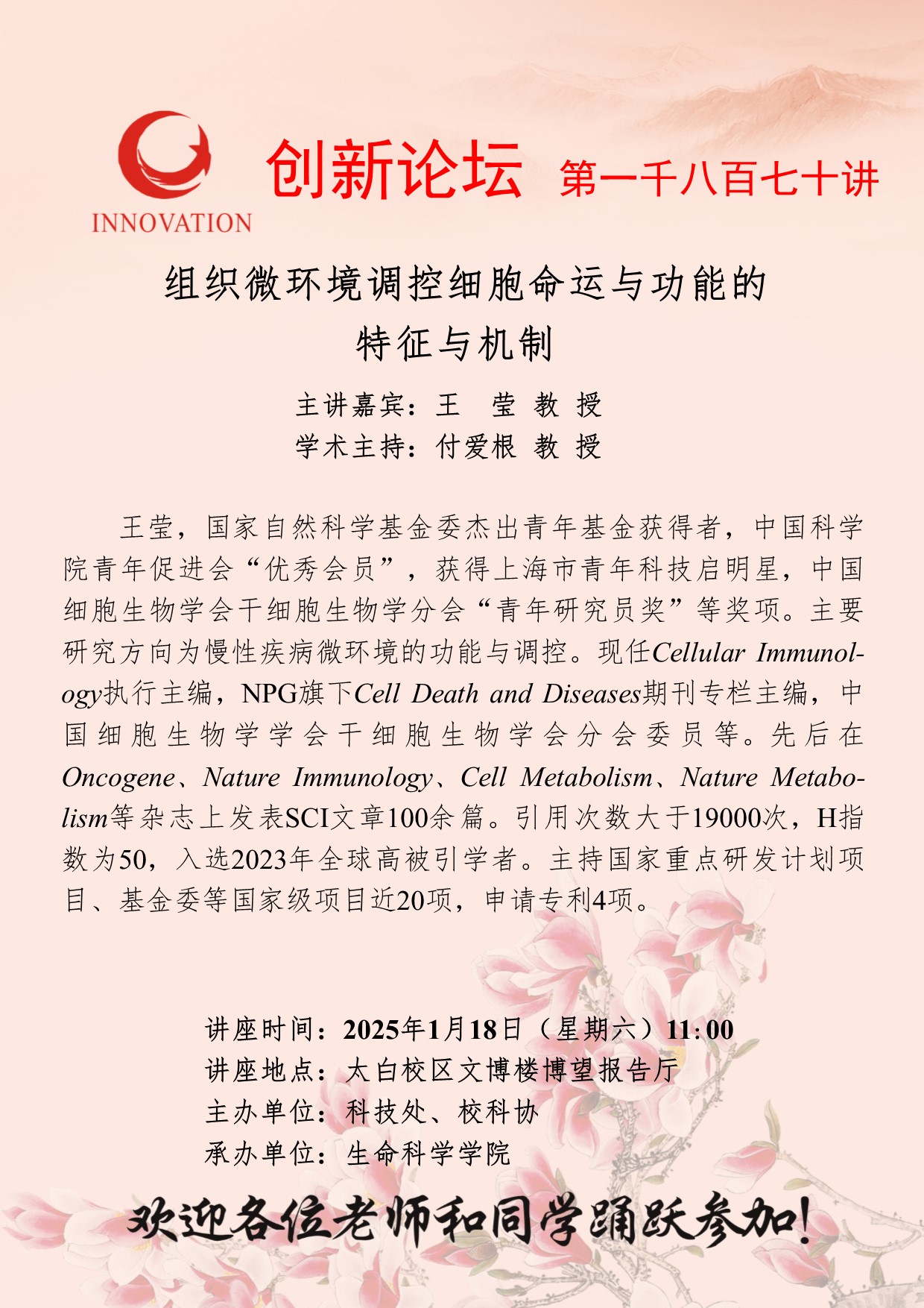 王莹 教授 九游会在线登录官网创新论坛第一千八百七十讲:组织微环境调控细胞命运与功能的特征与机制 讲座时间 2025年1月18日(星期六)11:00 讲座地点 太白校区文博楼博望报告厅 讲座人介绍 王莹 教授 讲座内容