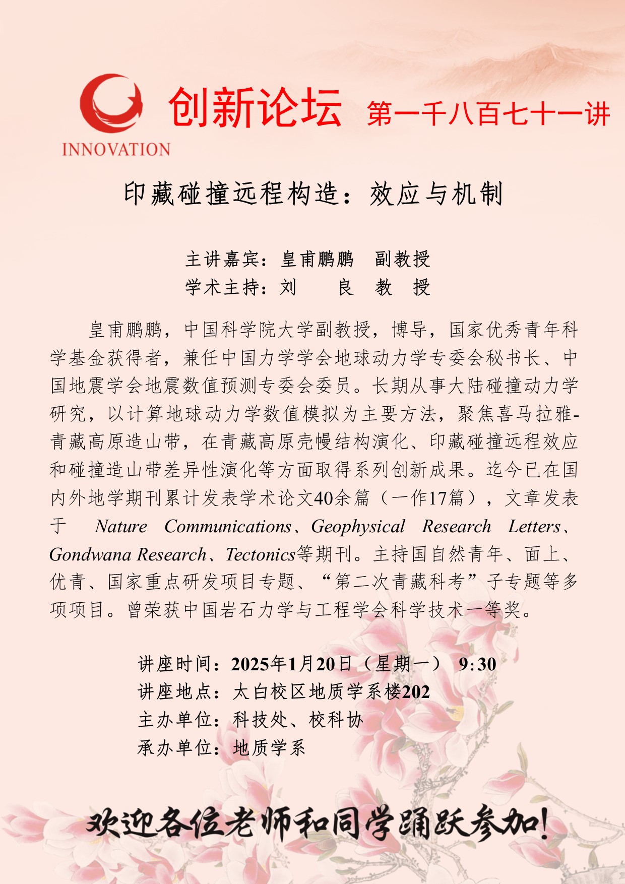 皇甫鹏鹏 副教授 九游会在线登录官网创新论坛第一千八百七十一讲:印藏碰撞远程构造:效应与机制 讲座时间 2025年1月20日(星期一) 9:30 讲座地点 太白校区地质学系楼202 讲座人介绍 皇甫鹏鹏 副教授 讲座内容