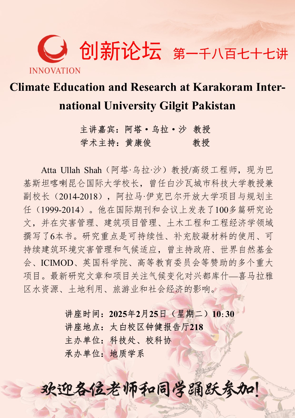 阿塔·乌拉·沙 教授 九游会在线登录官网创新论坛第一千八百七十七讲:Climate Education and Research at Karakoram International University Gilgit Pakistan 讲座时间 2025年2月25日(星期二)10:30 讲座地点 太白校区钟健报告厅218 讲座人介绍 阿塔·乌拉·沙 教授 讲座内容