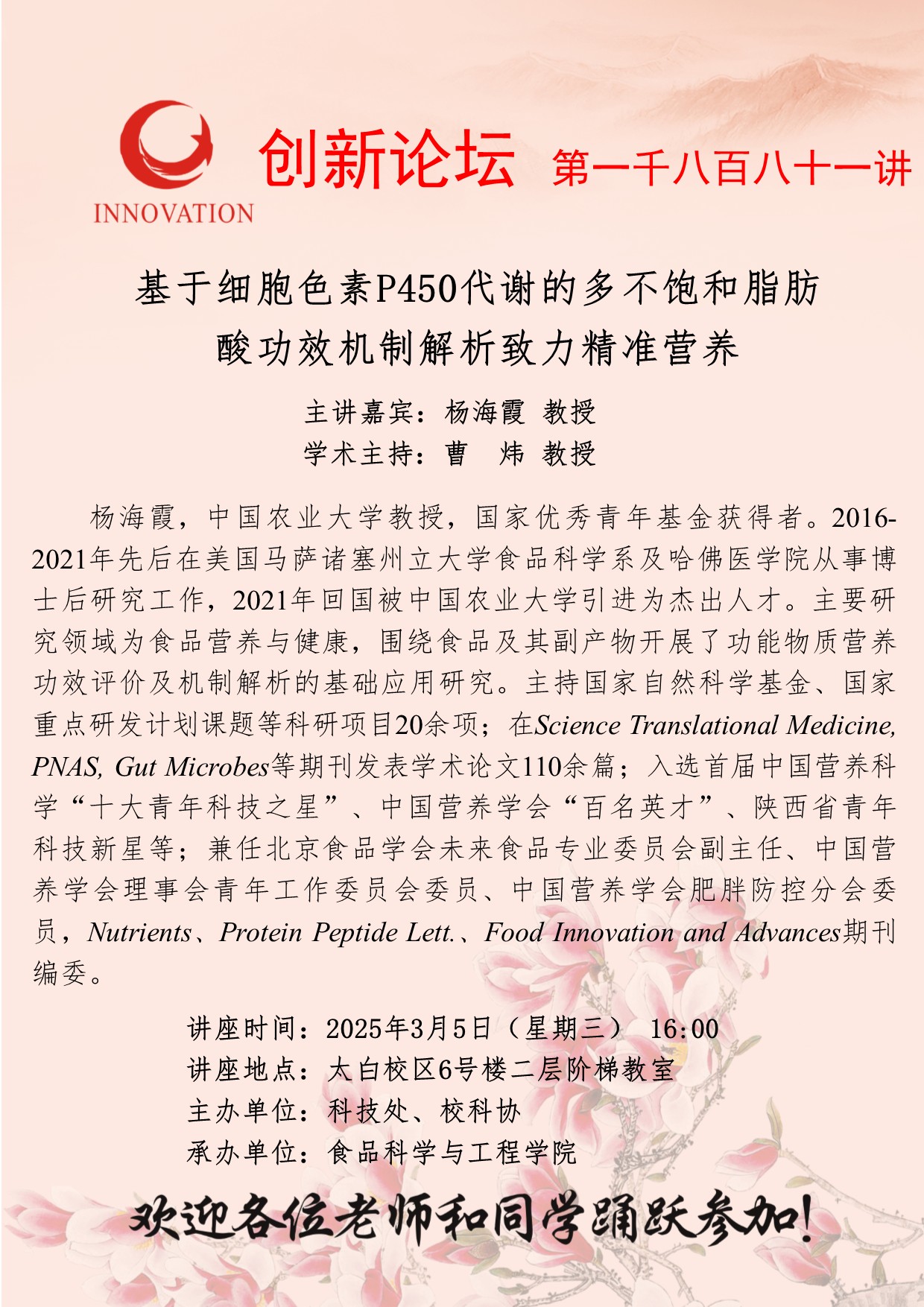 杨海霞 教授 九游会在线登录官网创新论坛第一千八百八十一讲:基于细胞色素P450代谢的多不饱和脂肪酸功效机制解析致力精准营养 讲座时间 2025年3月5日(星期三)16:00 讲座地点 太白校区6号楼二层阶梯教室 讲座人介绍 杨海霞 教授 讲座内容