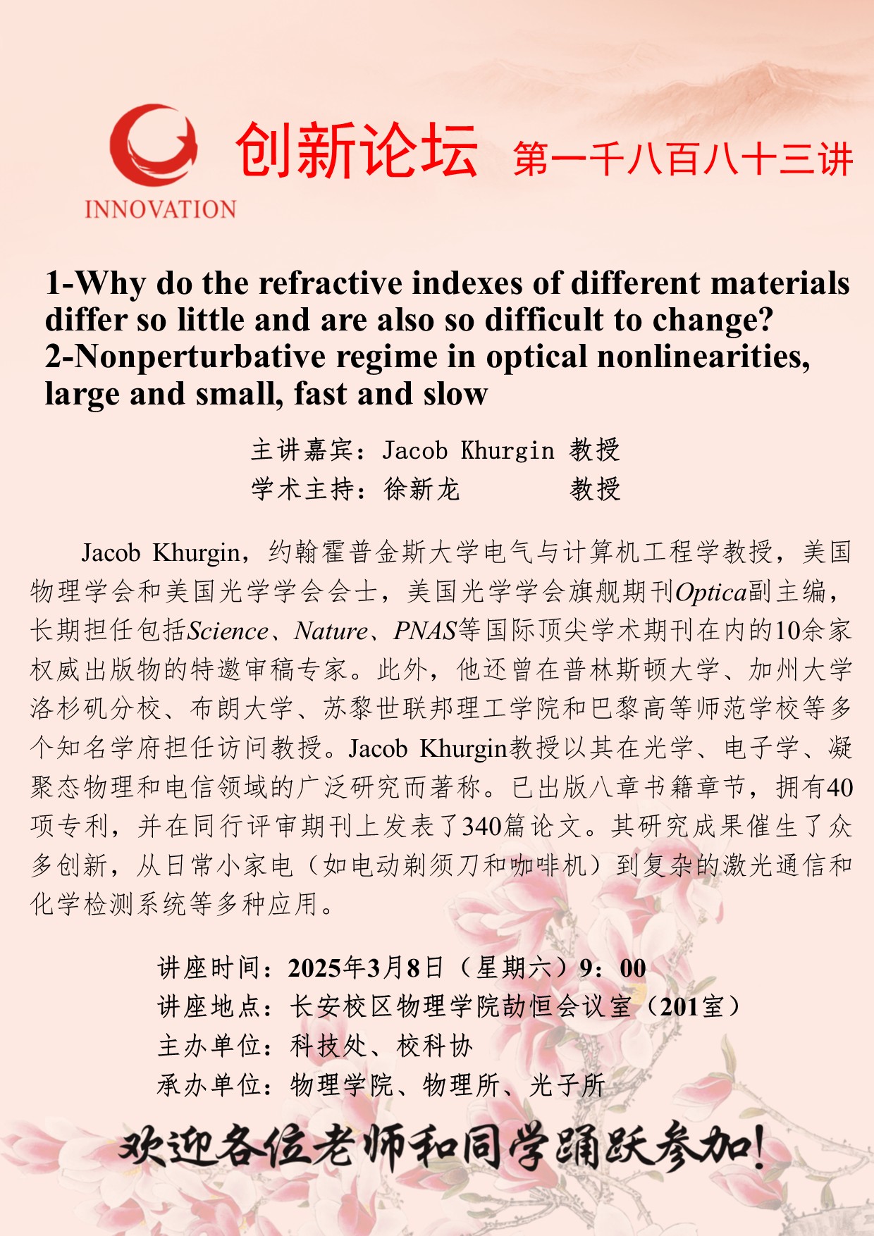 Jacob Khurgin 教授 九游会在线登录官网创新论坛第一千八百八十三讲:1-Why do the refractive indexes of different materials differ so little and are also so difficult to change? 讲座时间 2025年3月8日(星期六)9:00 讲座地点 长安校区物理学院劼恒会议室(201室) 讲座人介绍 Jacob Khurgin 教授 讲座内容