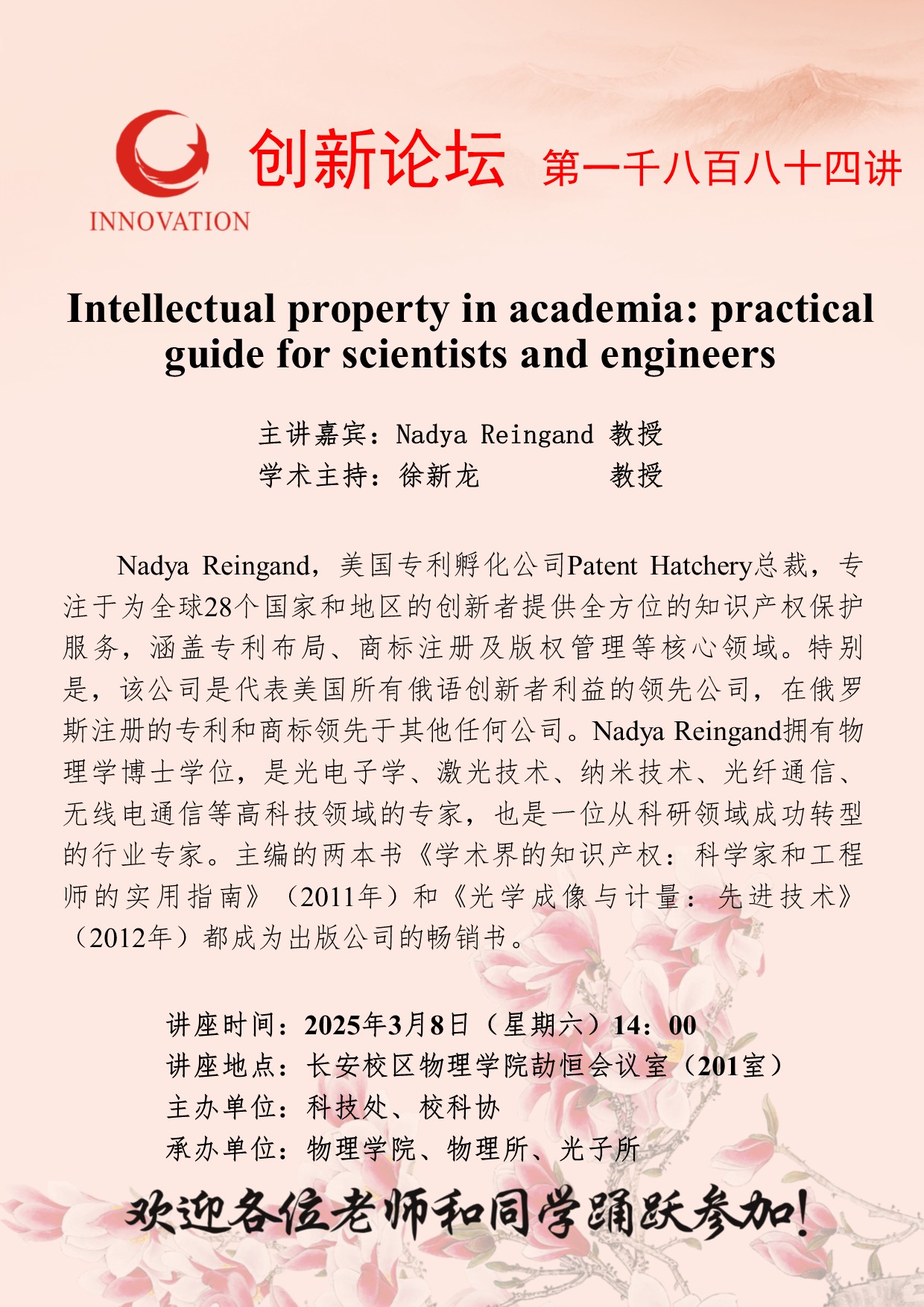 Nadya Reingand 教授 九游会在线登录官网创新论坛第一千八百八十四讲:Intellectual property in academia: practical guide for scientists and engineers 讲座时间 2025年3月8日(星期六)14:00 讲座地点 长安校区物理学院劼恒会议室(201室) 讲座人介绍 Nadya Reingand 教授 讲座内容