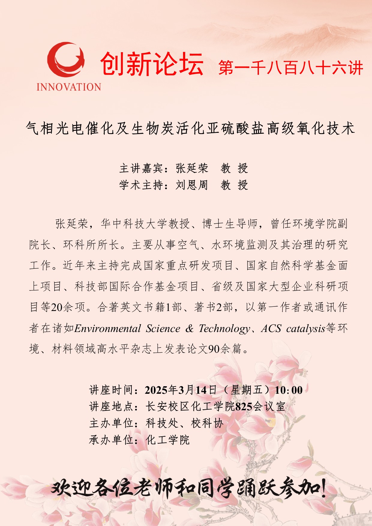 张延荣 教授 九游会在线登录官网创新论坛第一千八百八十六讲:气相光电催化及生物炭活化亚硫酸盐高级氧化技术 讲座时间 2025年3月14日(星期五)10:00 讲座地点 长安校区化工学院825会议室 讲座人介绍 张延荣 教授 讲座内容