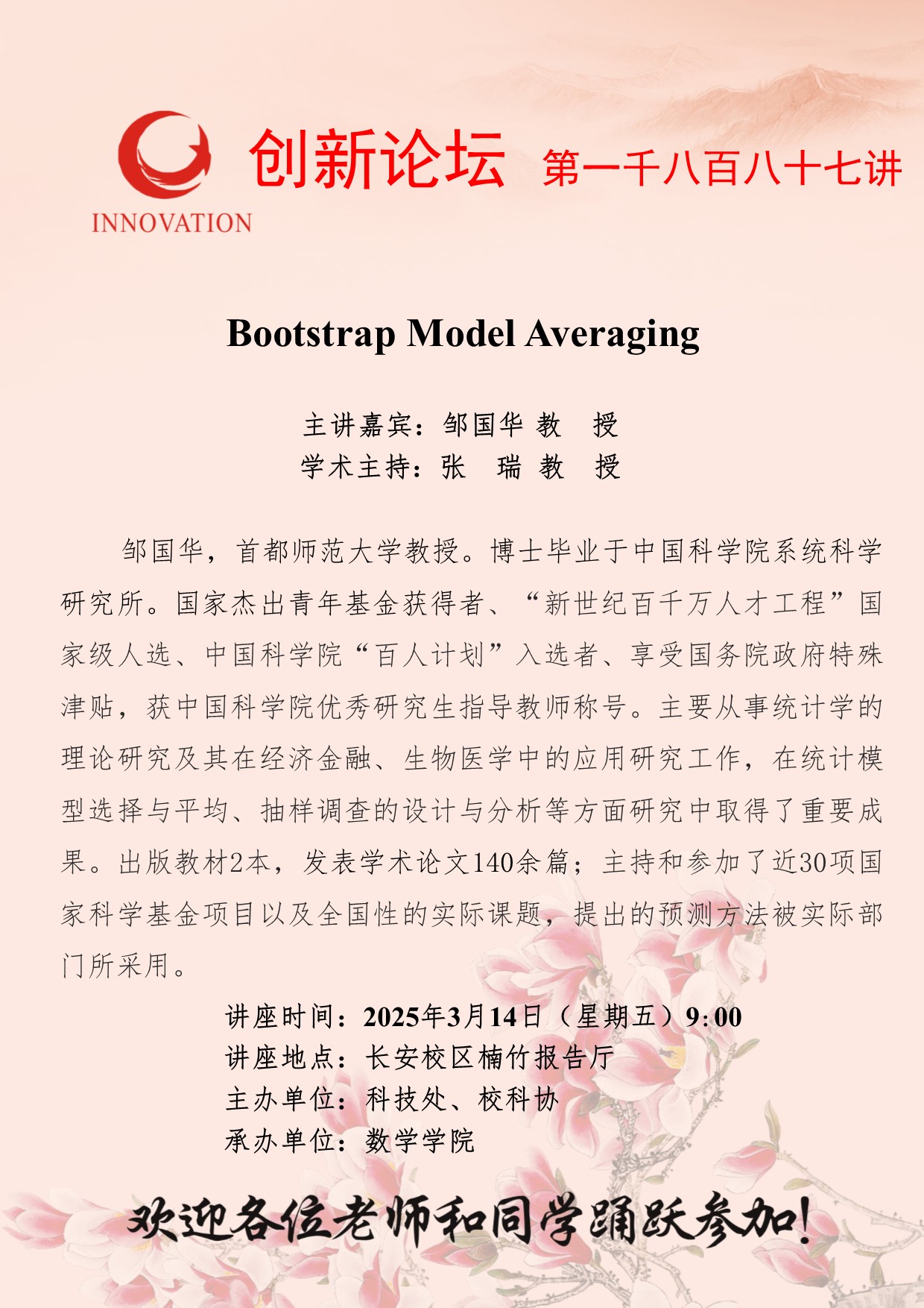 邹国华 教授 九游会在线登录官网创新论坛第一千八百八十七讲:Bootstrap Model Averaging 讲座时间 2025年3月14日(星期五)9:00 讲座地点 长安校区楠竹报告厅 讲座人介绍 邹国华 教授 讲座内容