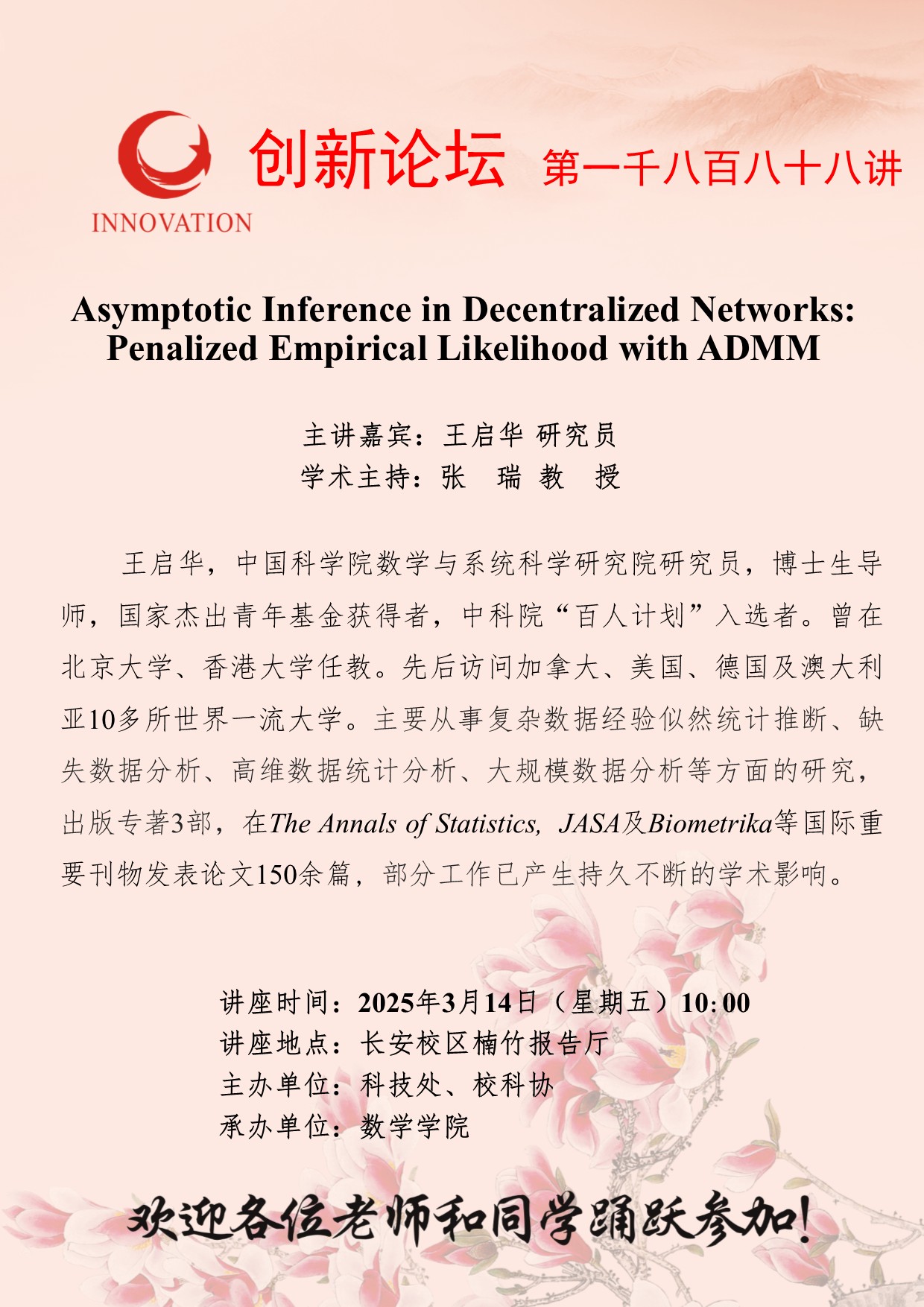 王启华 研究员 九游会在线登录官网创新论坛第一千八百八十八讲:Asymptotic Inference in Decentralized Networks: Penalized Empirical Likelihood with ADMM 讲座时间 2025年3月14日(星期五)10:00 讲座地点 长安校区楠竹报告厅 讲座人介绍 王启华 研究员 讲座内容