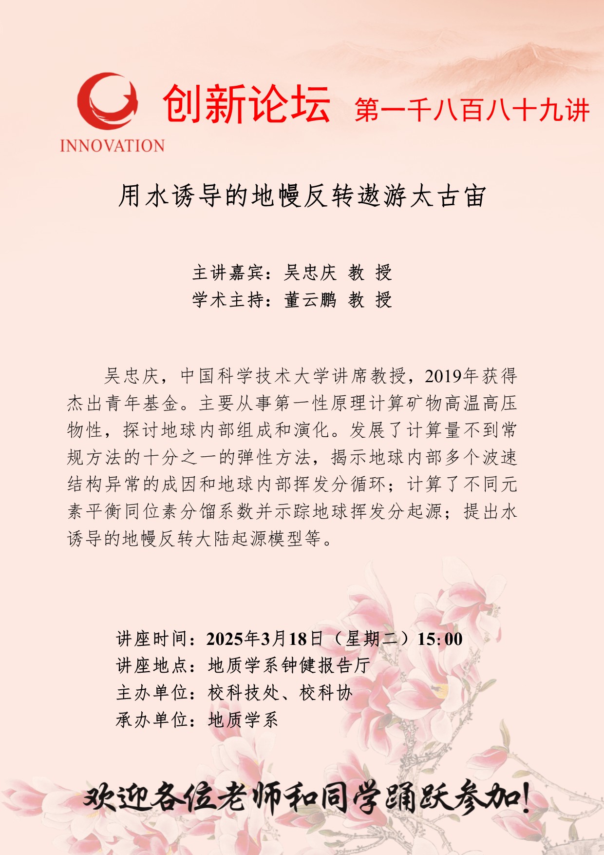 吴忠庆 教授 九游会在线登录官网创新论坛第一千八百八十九讲:用水诱导的地幔反转遨游太古宙 讲座时间 2025年3月18日(星期二)15:00 讲座地点 地质学系钟健报告厅 讲座人介绍 吴忠庆 教授 讲座内容