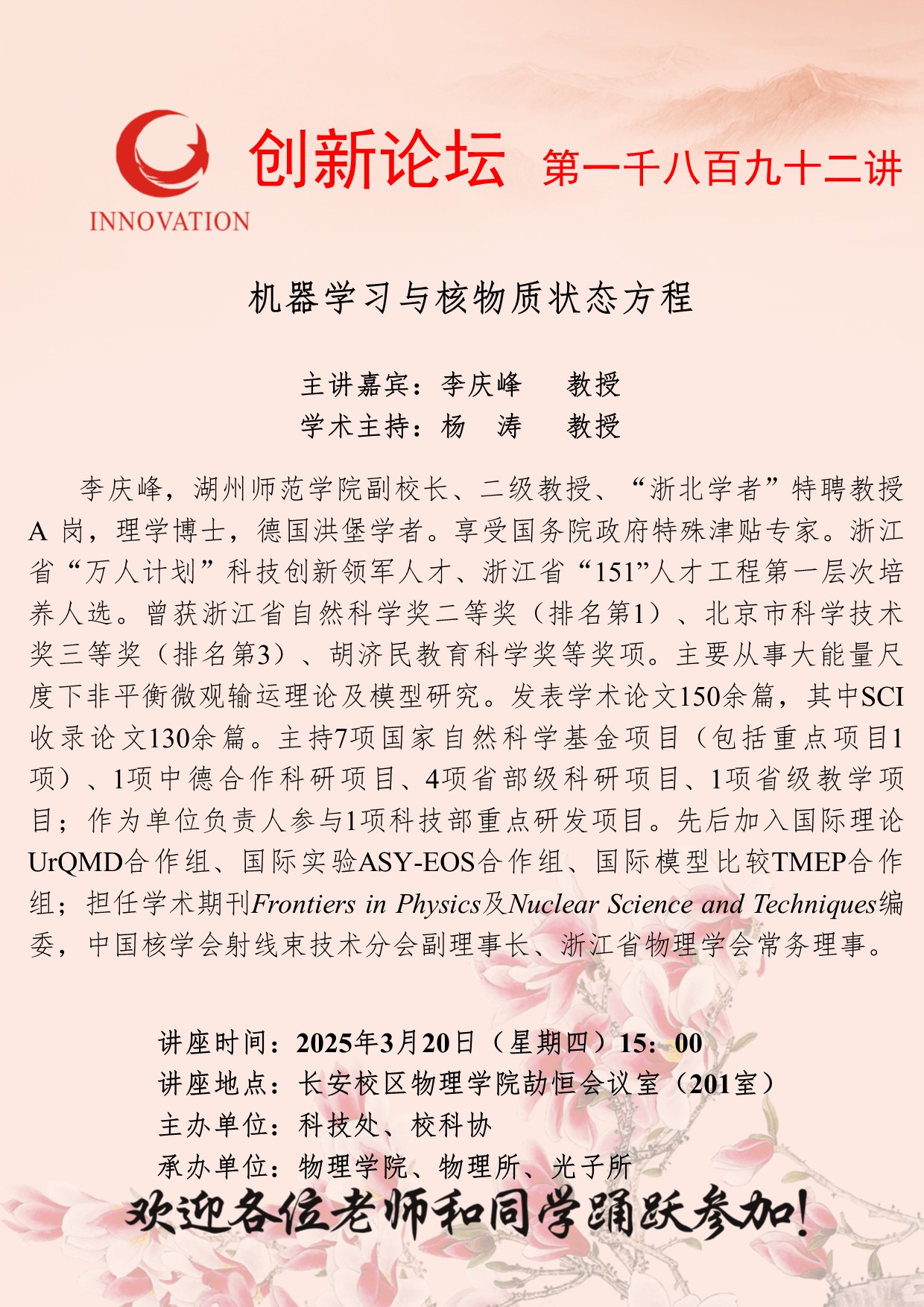 李庆峰 教授 九游会在线登录官网创新论坛第一千八百九十二讲:机器学习与核物质状态方程 讲座时间 2025年3月20日(星期四)15:00 讲座地点 长安校区物理学院劼恒会议室(201室) 讲座人介绍 李庆峰 教授 讲座内容
