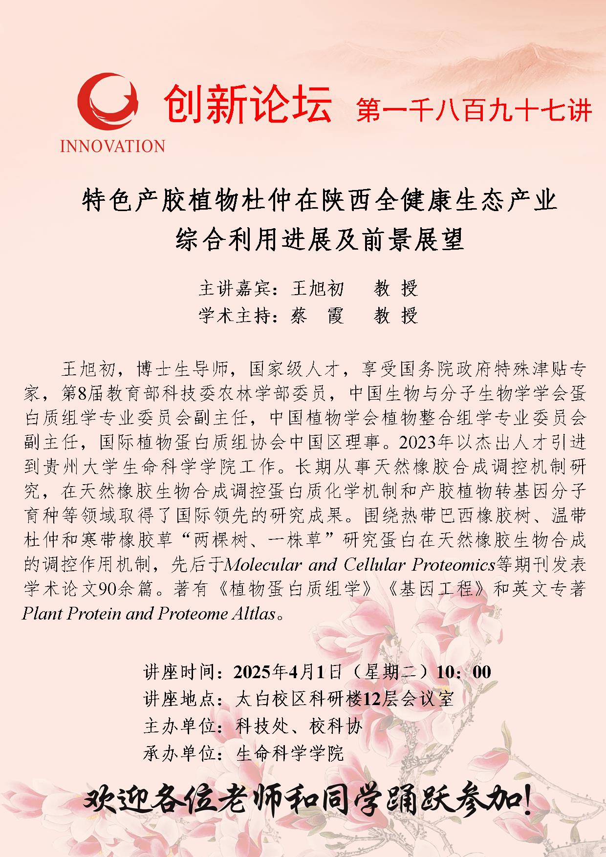 王旭初 教授 九游会在线登录官网创新论坛第一千八百九十七讲:特色产胶植物杜仲在陕西全健康生态产业综合利用进展及前景展望 讲座时间 2025年4月1日(星期二)10:00 讲座地点 太白校区科研楼12层会议室 讲座人介绍 王旭初 教授 讲座内容