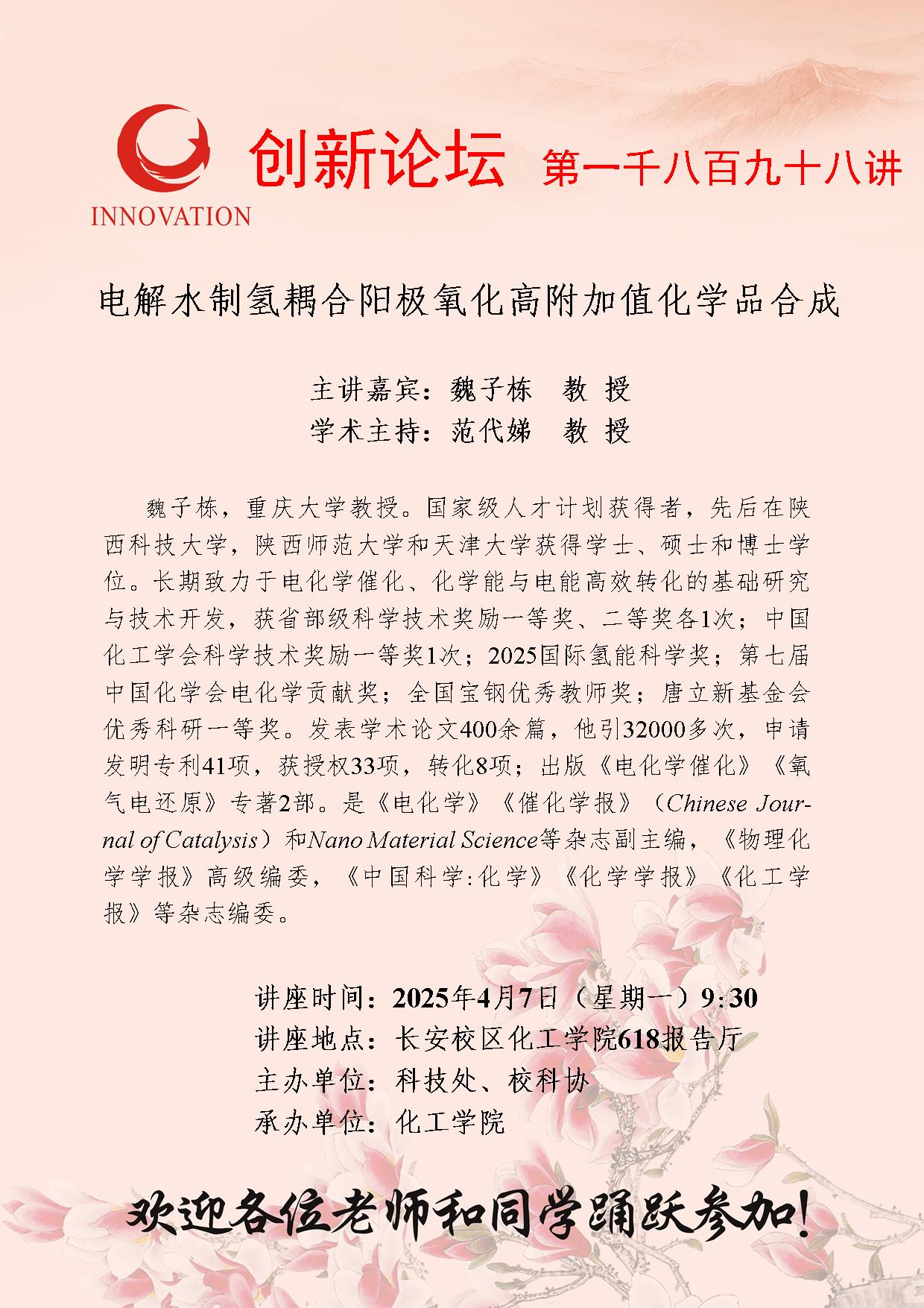 魏子栋 教授 九游会在线登录官网创新论坛第一千八百九十八讲:电解水制氢耦合阳极氧化高附加值化学品合成 讲座时间 2025年4月7日(星期一)9:30 讲座地点 长安校区化工学院618报告厅 讲座人介绍 魏子栋 教授 讲座内容