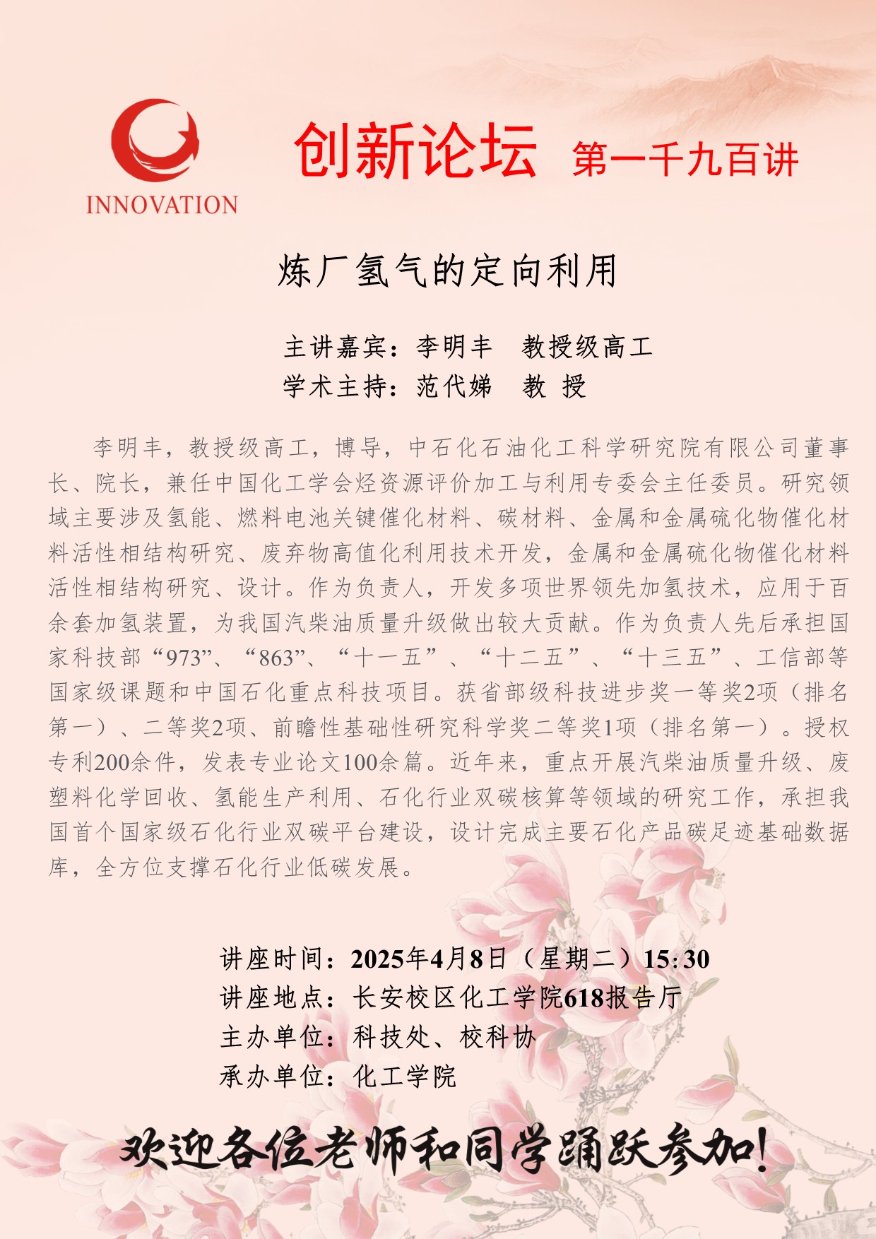 李明丰 教授级高工 九游会在线登录官网创新论坛第一千九百讲:炼厂氢气的定向利用 讲座时间 2025年4月8日(星期二)15:30 讲座地点 长安校区化工学院618报告厅 讲座人介绍 李明丰 教授级高工 讲座内容