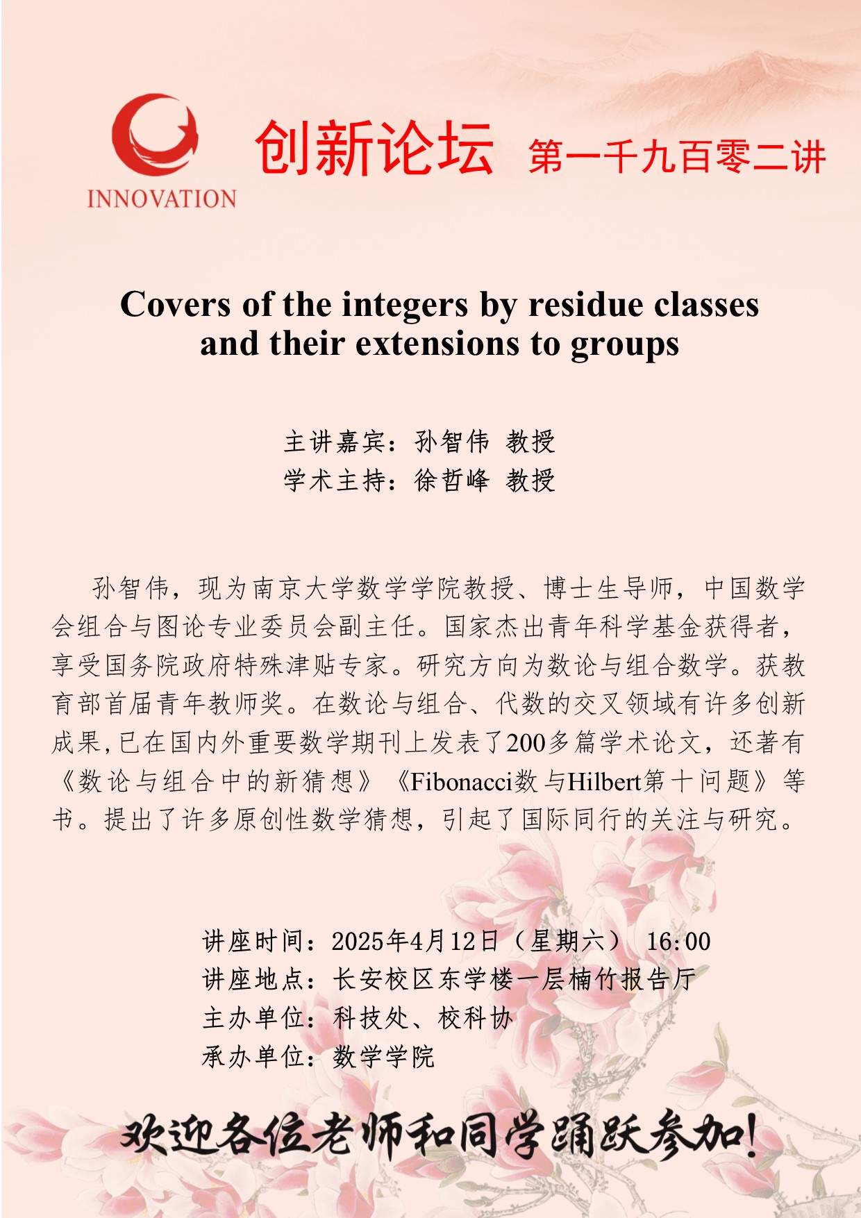 孙智伟 教授 九游会在线登录官网创新论坛第一千九百零二讲:Covers of the integers by residue classes and their extensions to groups 讲座时间 2025年4月12日(星期六) 16:00 讲座地点 长安校区东学楼一层楠竹报告厅 讲座人介绍 孙智伟 教授 讲座内容