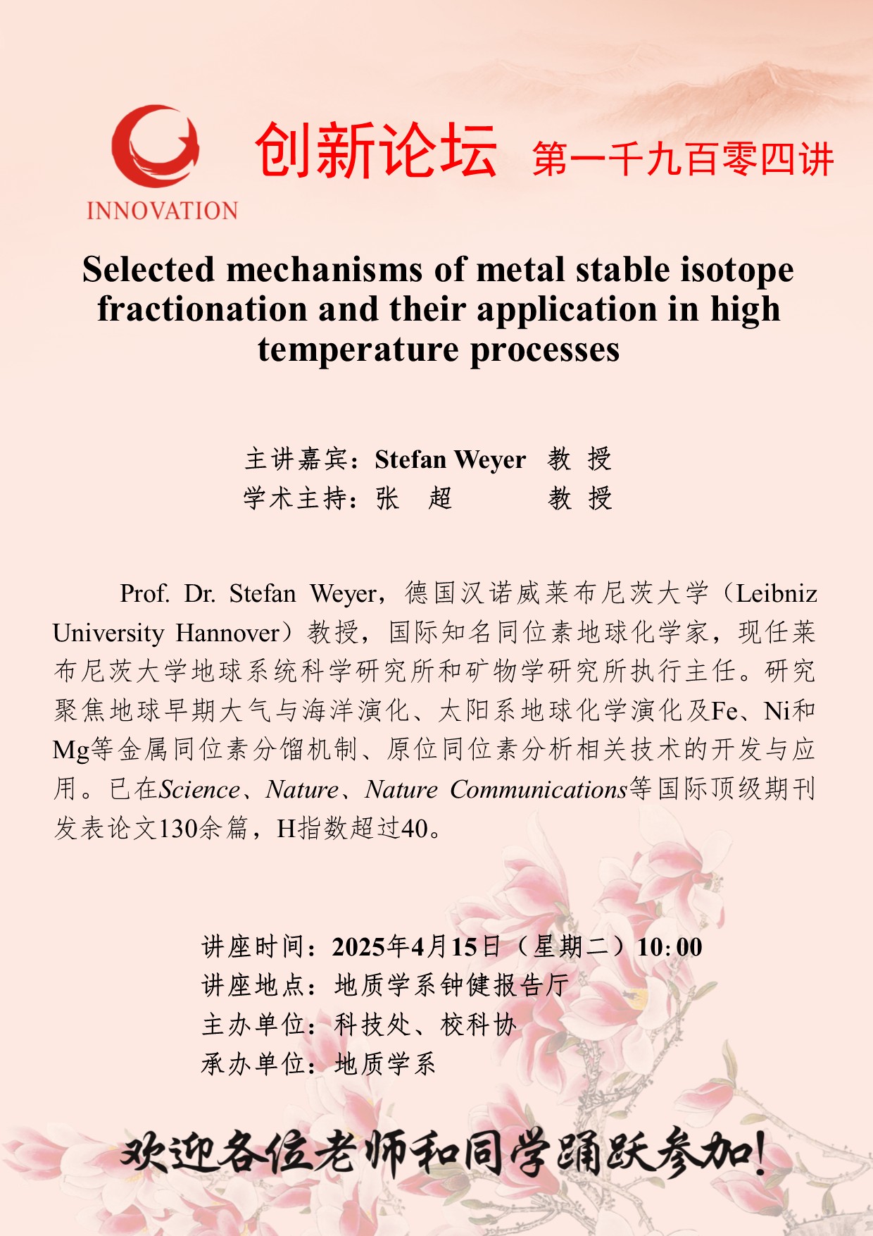 Stefan Weyer 教授 九游会在线登录官网创新论坛第一千九百零四讲:Selected mechanisms of metal stable isotope fractionation and their application in high temperature processes 讲座时间 2025年4月15日(星期二)10:00 讲座地点 地质学系钟健报告厅 讲座人介绍 Stefan Weyer 教授 讲座内容