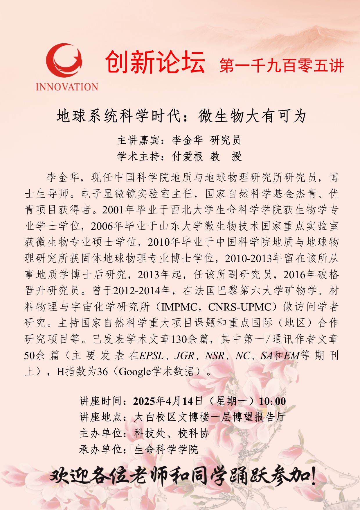 李金华 研究员 九游会在线登录官网创新论坛第一千九百零五讲:地球系统科学时代:微生物大有可为 讲座时间 2025年4月14日(星期一)10:00 讲座地点 太白校区文博楼一层博望报告厅 讲座人介绍 李金华 研究员 讲座内容