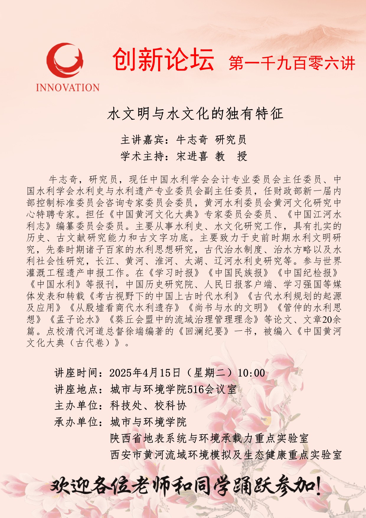 牛志奇 研究员 九游会在线登录官网创新论坛第一千九百零六讲:水文明与水文化的独有特征 讲座时间 2025年4月15日(星期二)10:00 讲座地点 城市与环境学院516会议室 讲座人介绍 牛志奇 研究员 讲座内容
