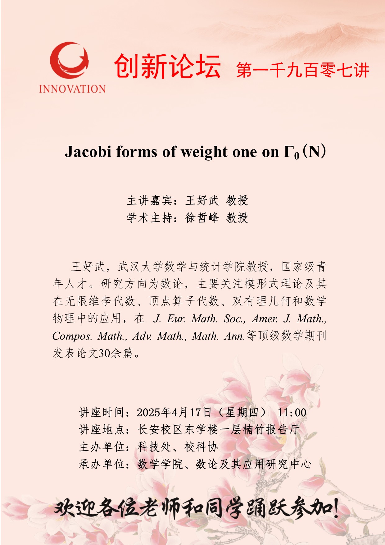 王好武 教授 九游会在线登录官网创新论坛第一千九百零七讲:Jacobi forms of weight one on Γ0(N) 讲座时间 2025年4月17日(星期四) 11:00 讲座地点 长安校区东学楼一层楠竹报告厅 讲座人介绍 王好武 教授 讲座内容