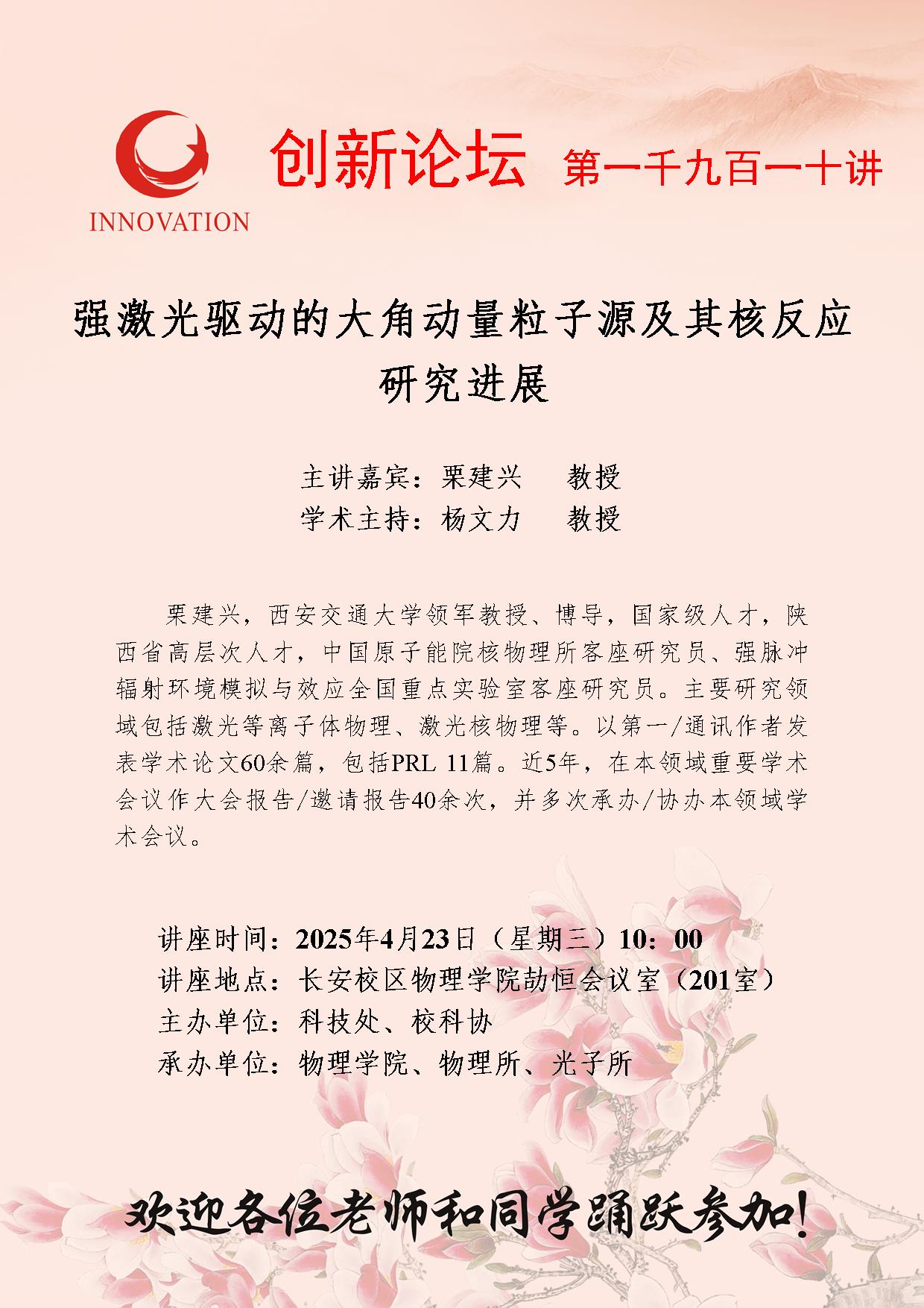 栗建兴 教授 九游会在线登录官网创新论坛第一千九百一十讲:强激光驱动的大角动量粒子源及其核反应研究进展 讲座时间 2025年4月23日(星期三)10:00 讲座地点 长安校区物理学院劼恒会议室(201室) 讲座人介绍 栗建兴 教授 讲座内容