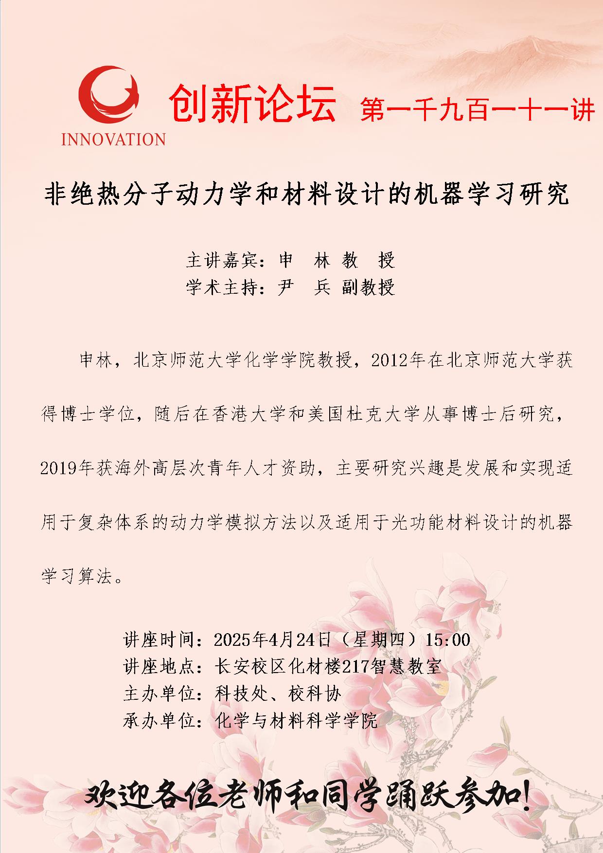 申林 教授 九游会在线登录官网创新论坛第一千九百一十一讲:非绝热分子动力学和材料设计的机器学习研究 讲座时间 2025年4月24日(星期四)15:00 讲座地点 长安校区化材楼217智慧教室 讲座人介绍 申林 教授 讲座内容