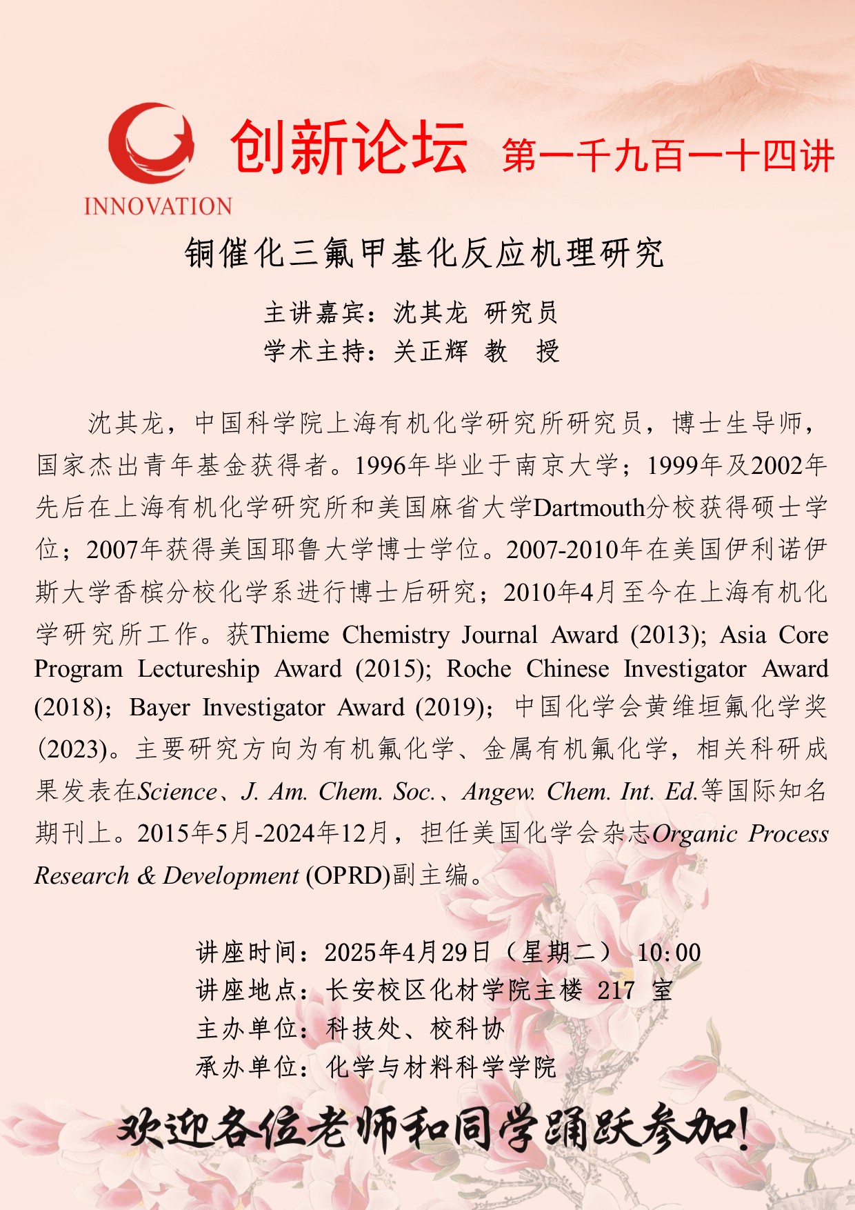 沈其龙 研究员 九游会在线登录官网创新论坛第一千九百一十四讲:铜催化三氟甲基化反应机理研究 讲座时间 2025年4月29日(星期二) 10:00 讲座地点 长安校区化材学院主楼 217 室 讲座人介绍 沈其龙 研究员 讲座内容