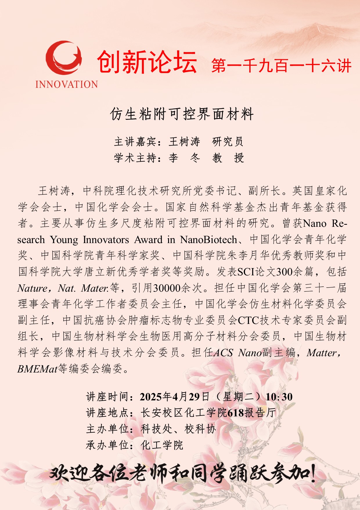 王树涛 研究员 九游会在线登录官网创新论坛第一千九百一十六讲:仿生粘附可控界面材料 讲座时间 2025年4月29日(星期二)10:30 讲座地点 长安校区化工学院618报告厅 讲座人介绍 王树涛 研究员 讲座内容