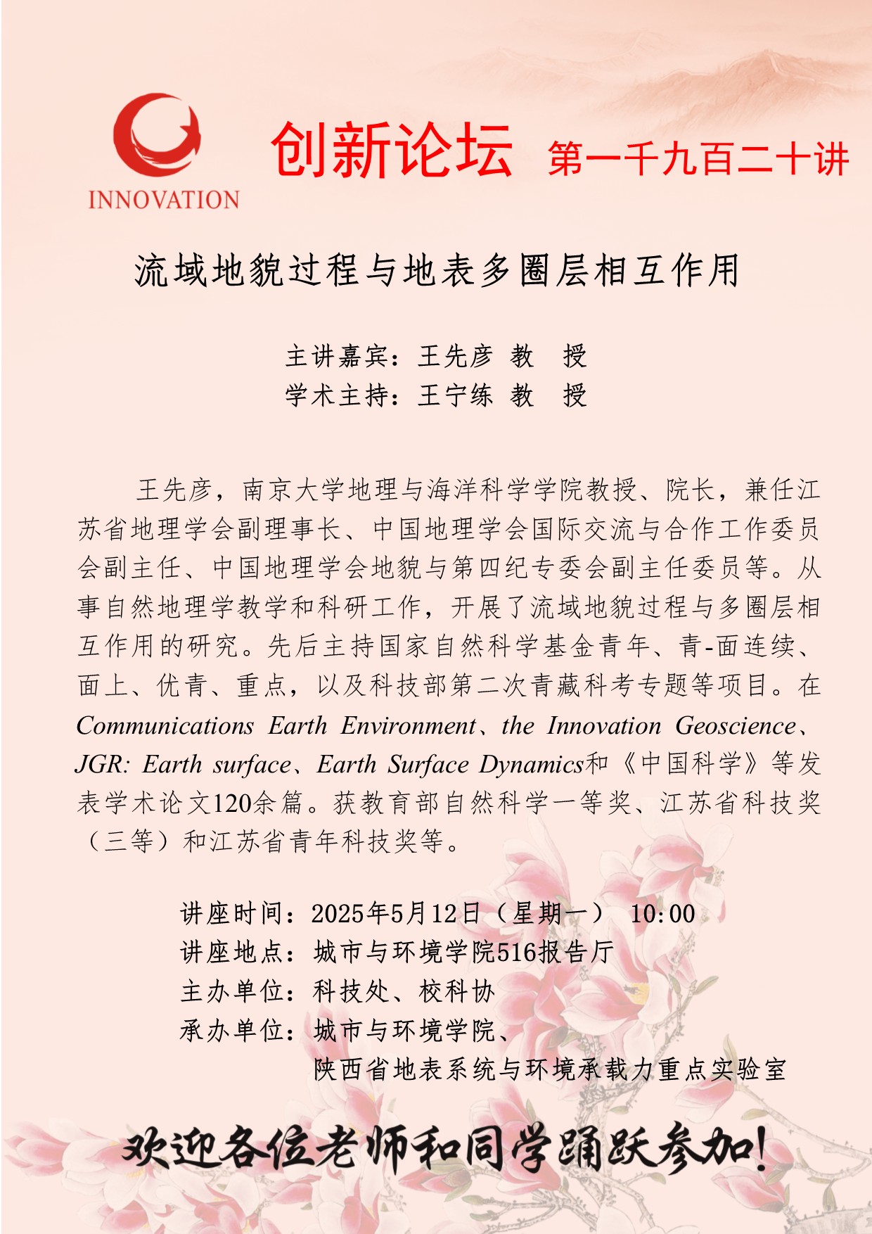 王先彦 教授 九游会在线登录官网创新论坛第一千九百二十讲:流域地貌过程与地表多圈层相互作用 讲座时间 2025年5月12日(星期一) 10:00 讲座地点 城市与环境学院516报告厅 讲座人介绍 王先彦 教授 讲座内容