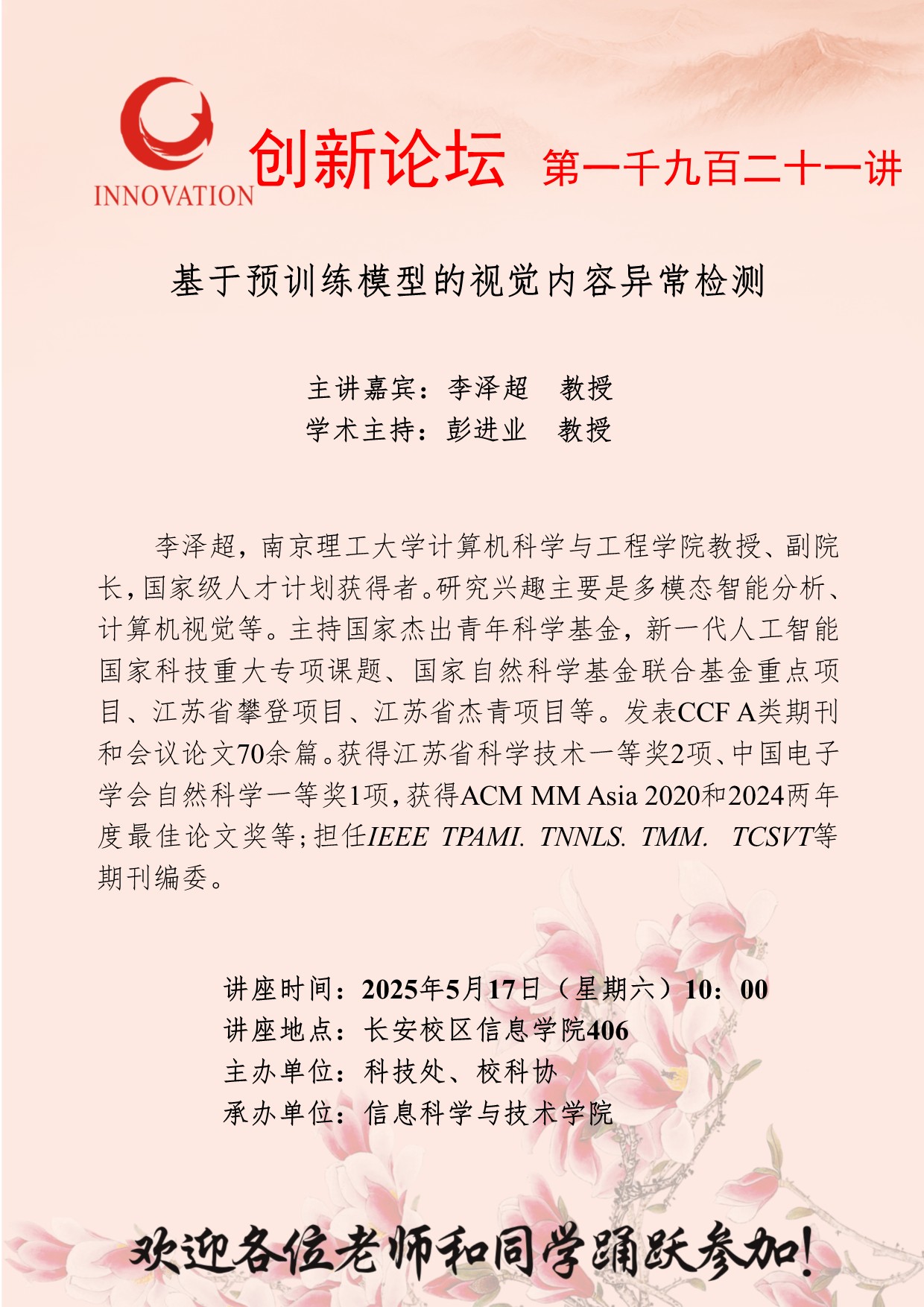 李泽超 教授 九游会在线登录官网创新论坛第一千九百二十一讲:基于预训练模型的视觉内容异常检测 讲座时间 2025年5月17日(星期六)10:00 讲座地点 长安校区信息学院406 讲座人介绍 李泽超 教授 讲座内容