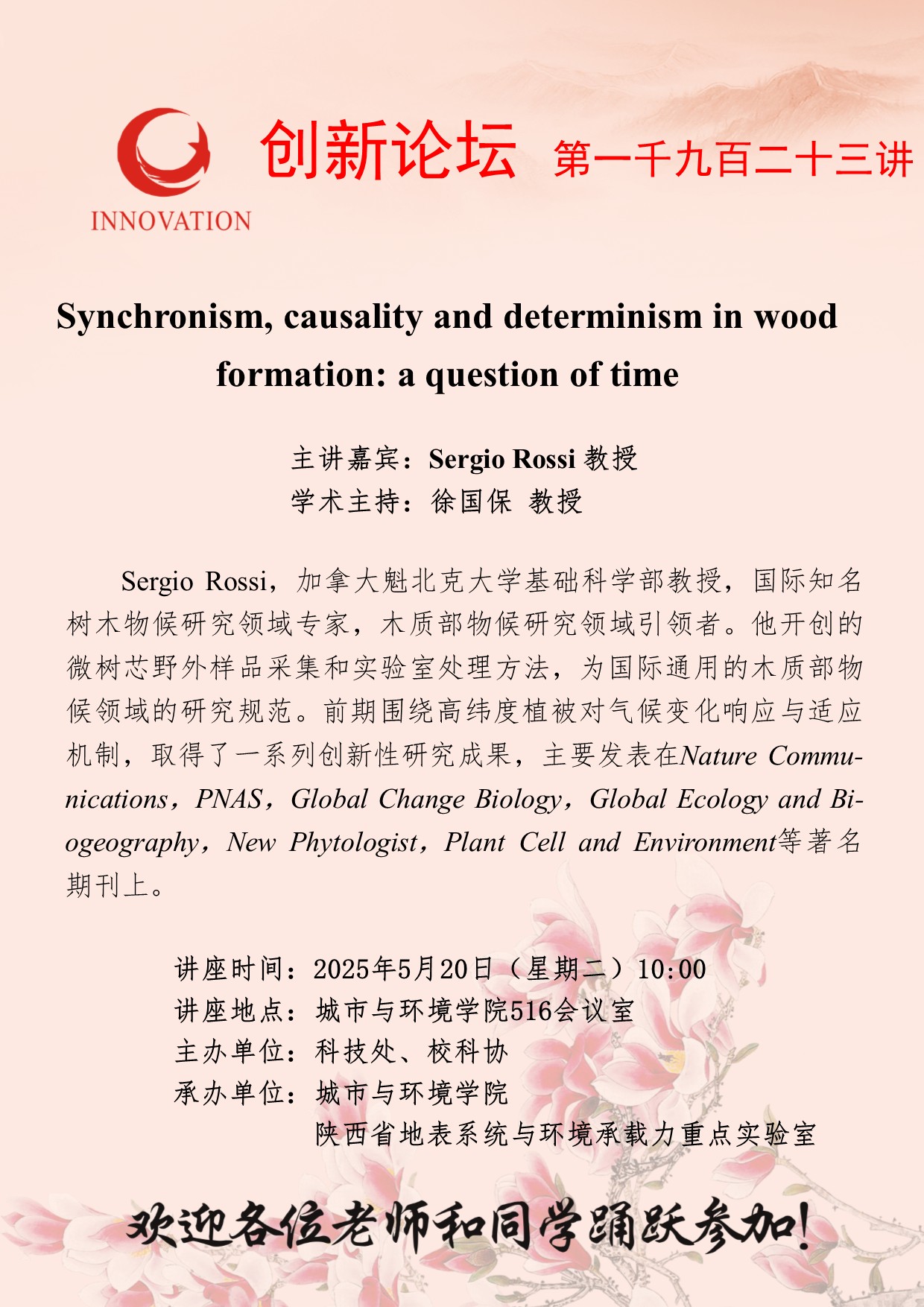 Sergio Rossi 教授 九游会在线登录官网创新论坛第一千九百二十三讲:Synchronism, causality and determinism in wood formation: a question of time 讲座时间 2025年5月20日(星期二)10:00 讲座地点 城市与环境学院516会议室 讲座人介绍 Sergio Rossi 教授 讲座内容