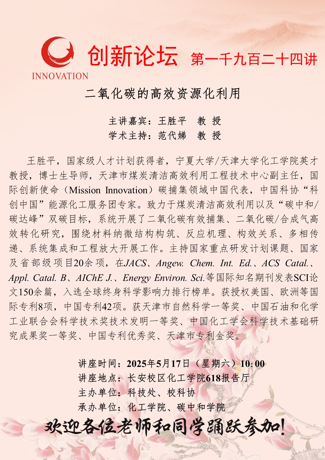 王胜平 教授 九游会在线登录官网创新论坛第一千九百二十四讲:二氧化碳的高效资源化利用 讲座时间 2025年5月17日(星期六)10:00 讲座地点 长安校区化工学院618报告厅 讲座人介绍 王胜平 教授 讲座内容